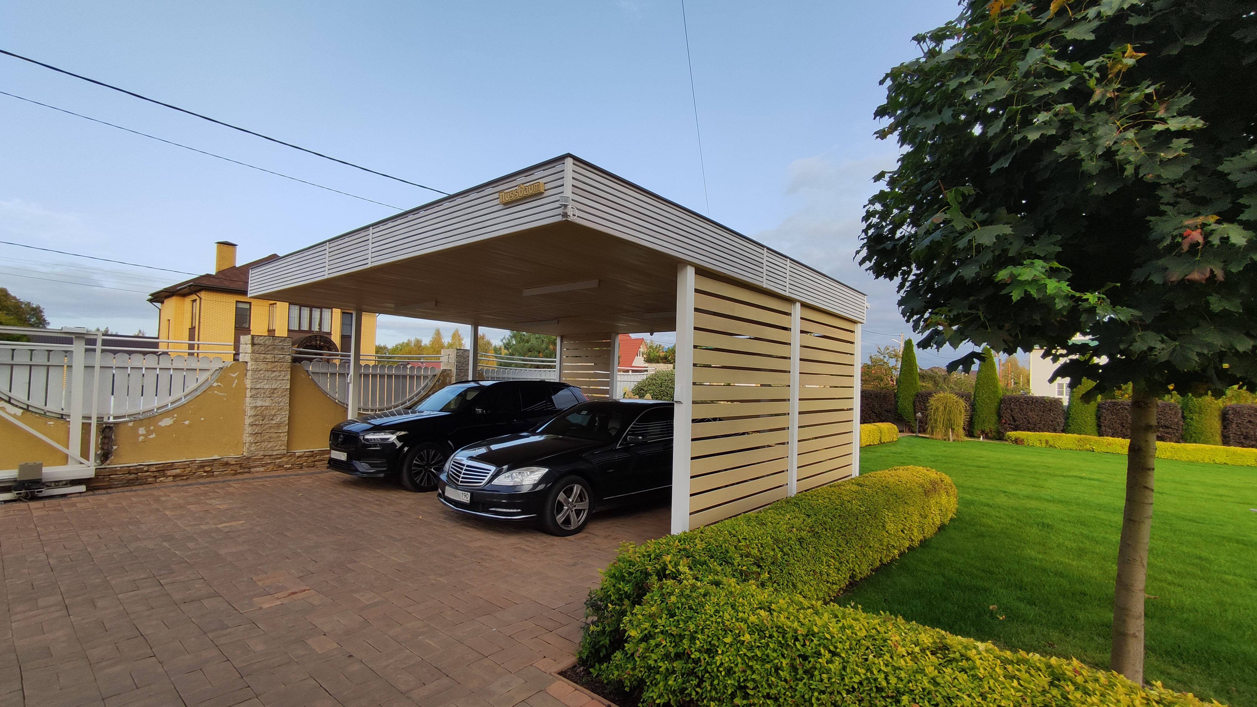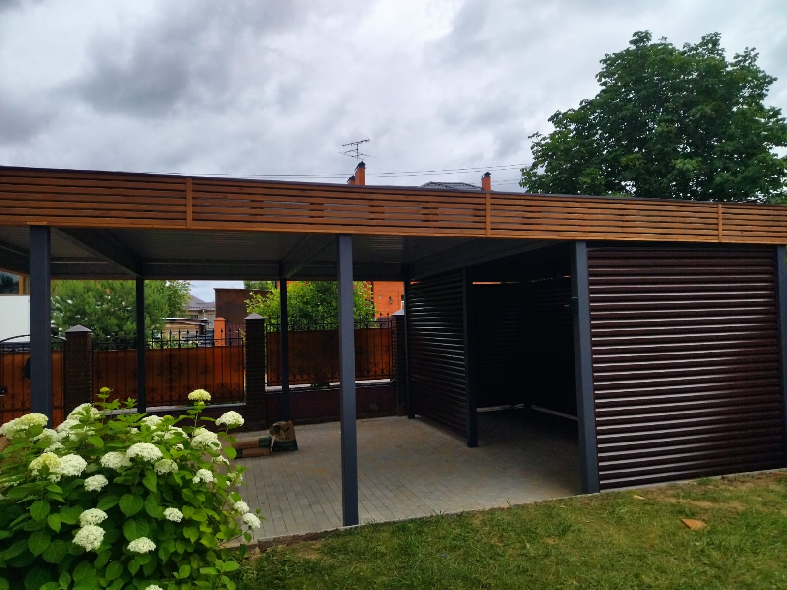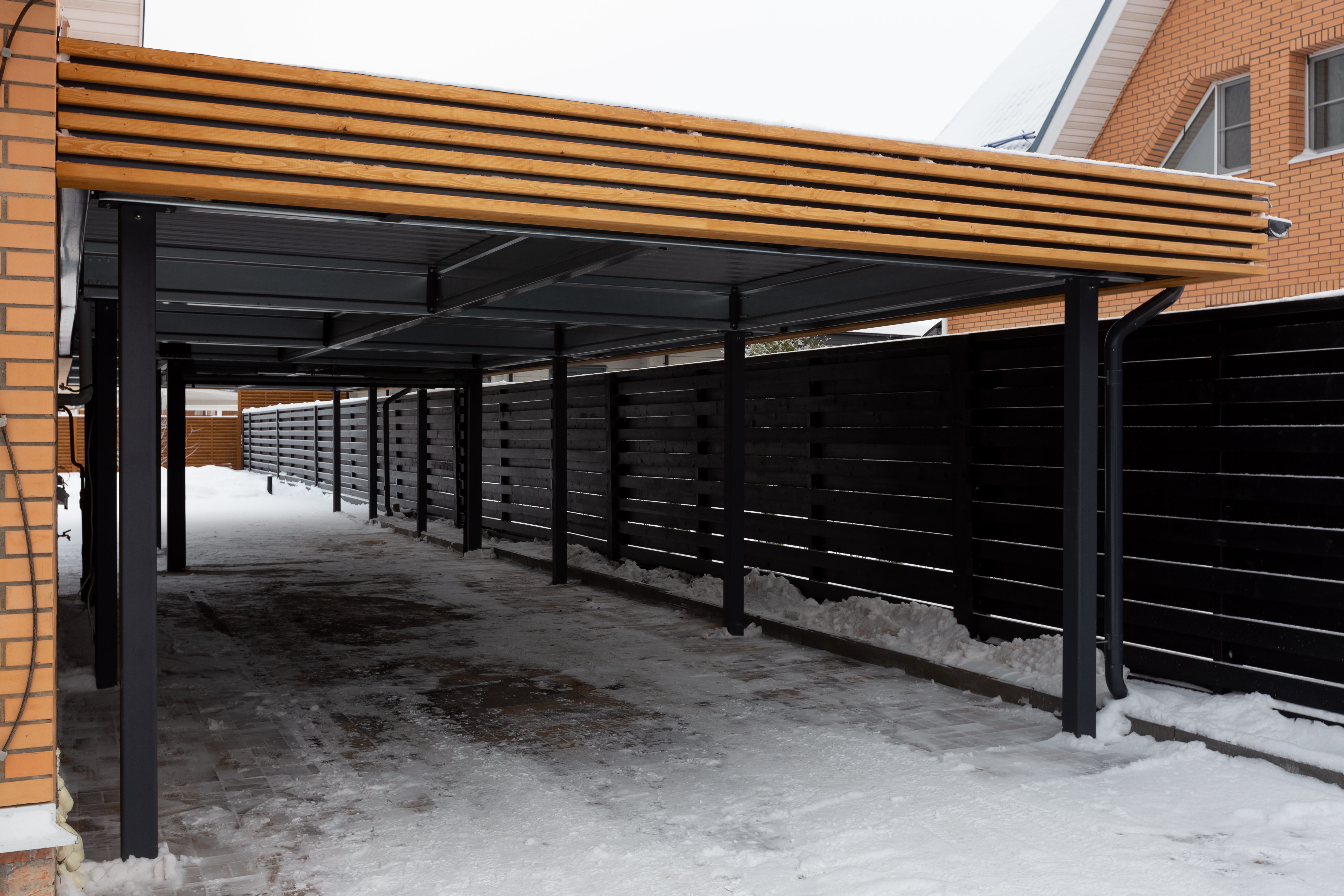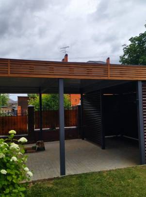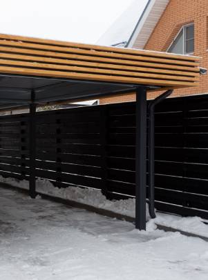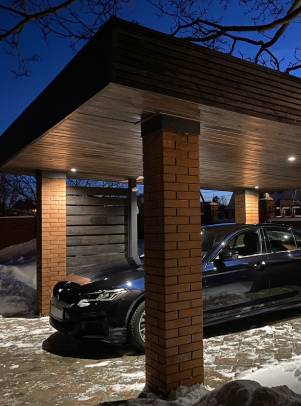 Навесы с нестандартной геометрией и конфигурацией, интеграция с забором или въездной группой, примыкание навеса к дому…