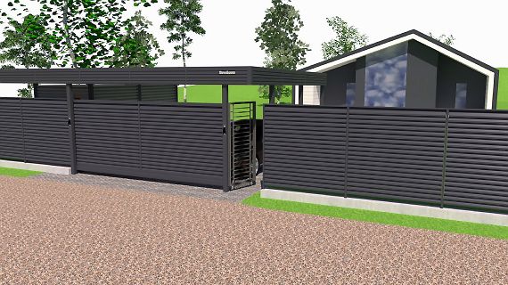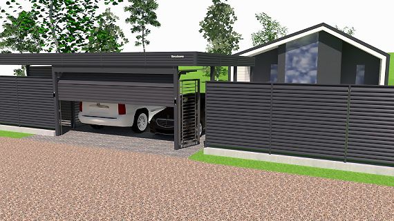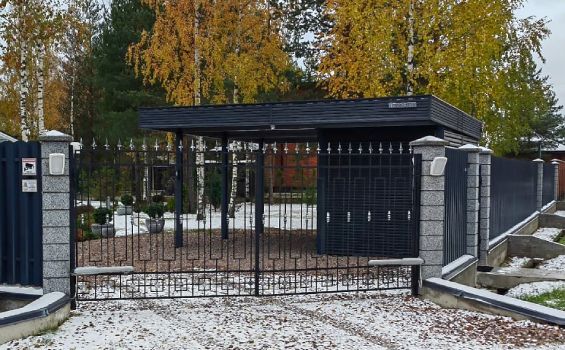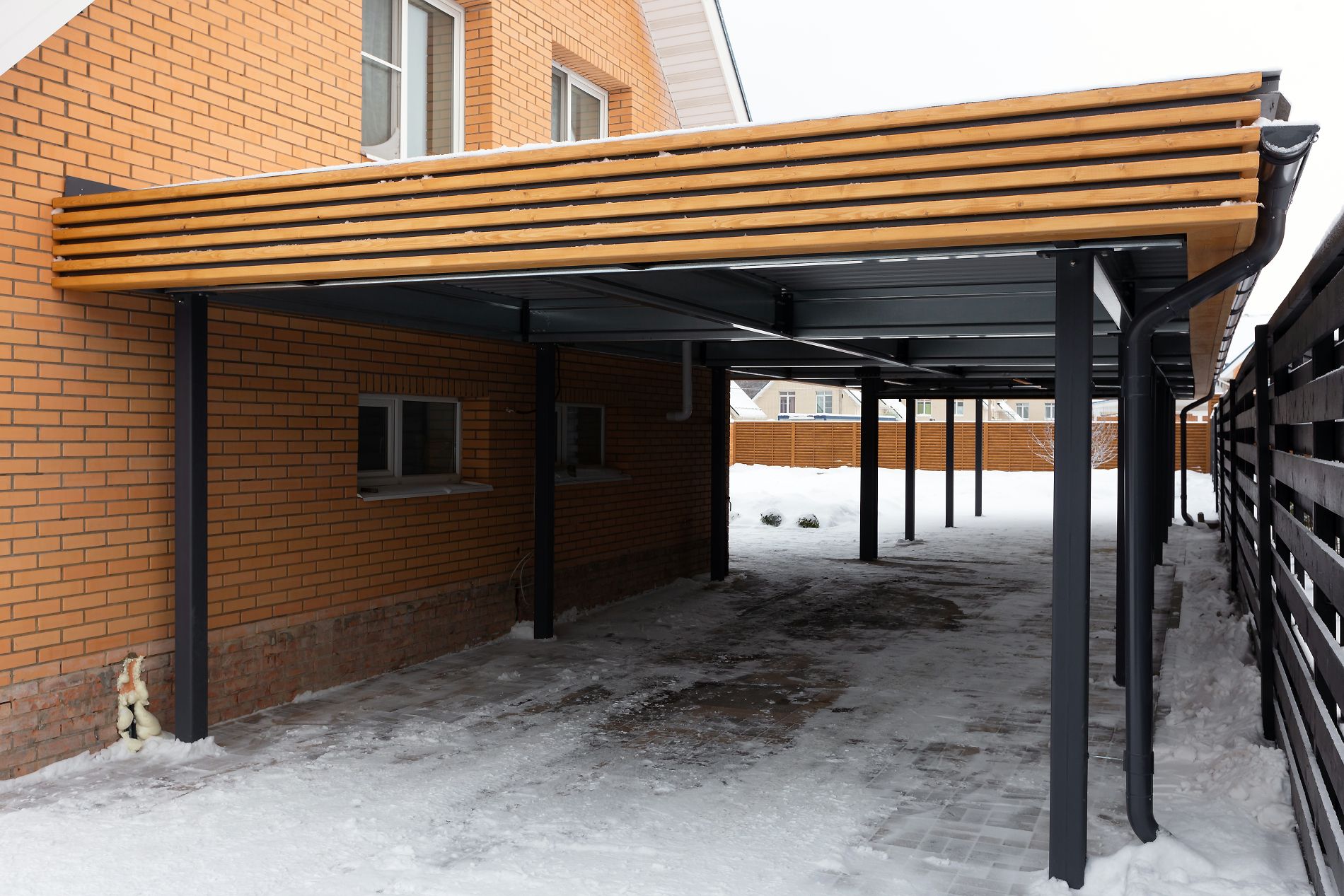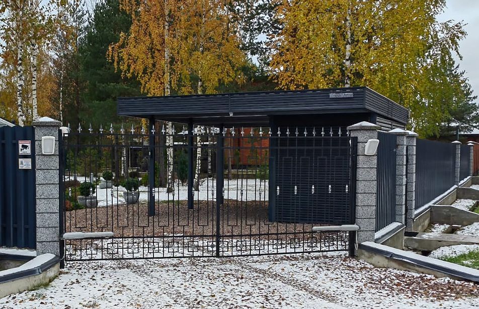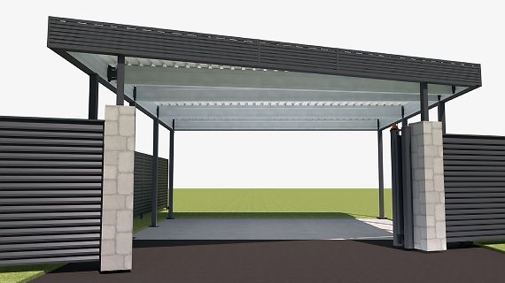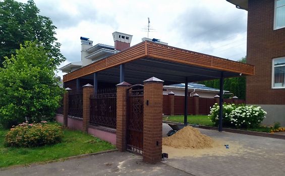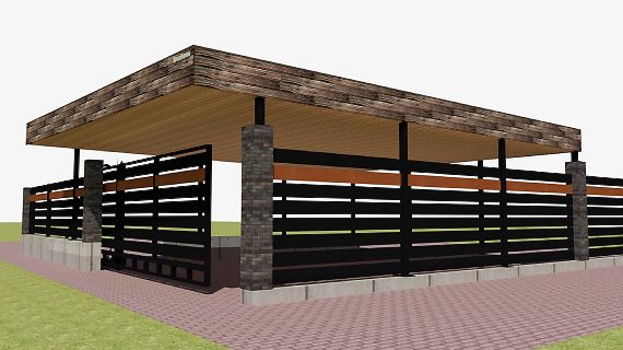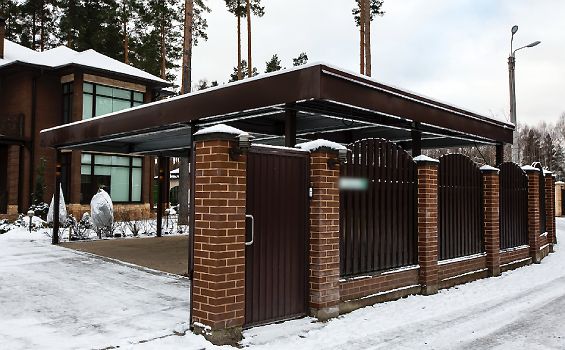 Эффективным и эффектным решением является использование стоек навеса в качестве опорных столбов для забора, ворот и калитки. Если забор уже стоит, возможно опирание навеса на существующие бетонные или кирпичные столбы забора.