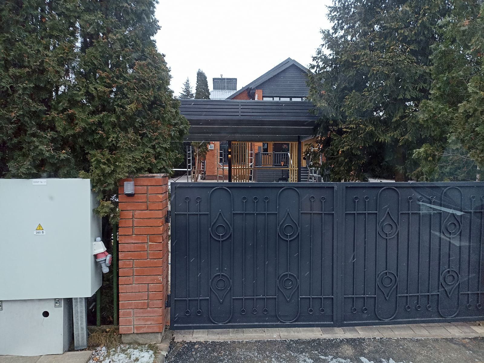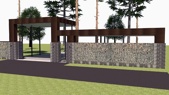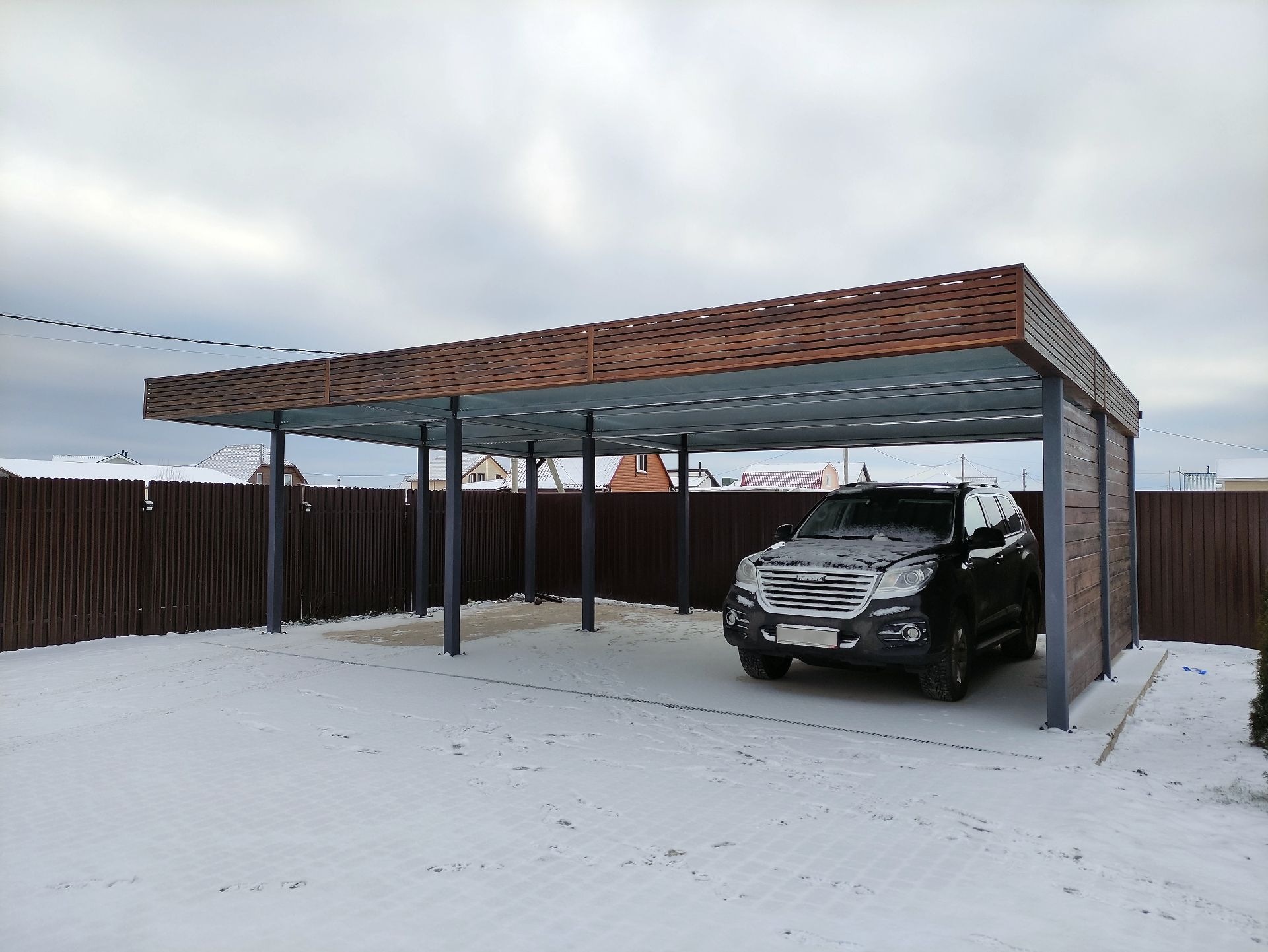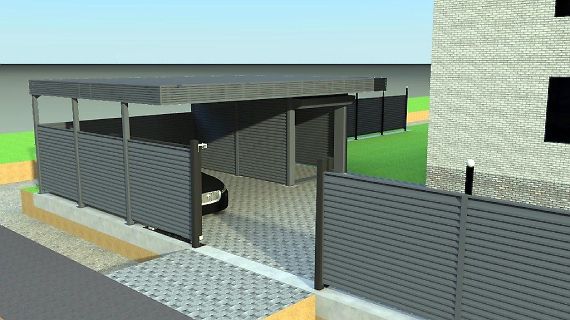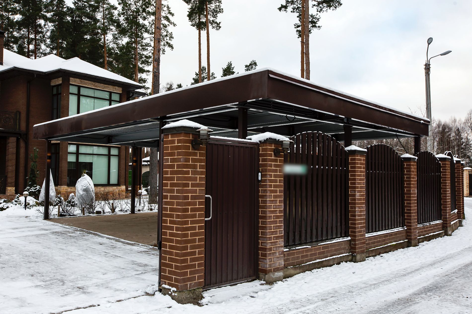 Эффективным и эффектным решением является использование стоек навеса в качестве опорных столбов для забора, ворот и калитки. Если забор уже стоит, возможно опирание навеса на существующие бетонные или кирпичные столбы забора.