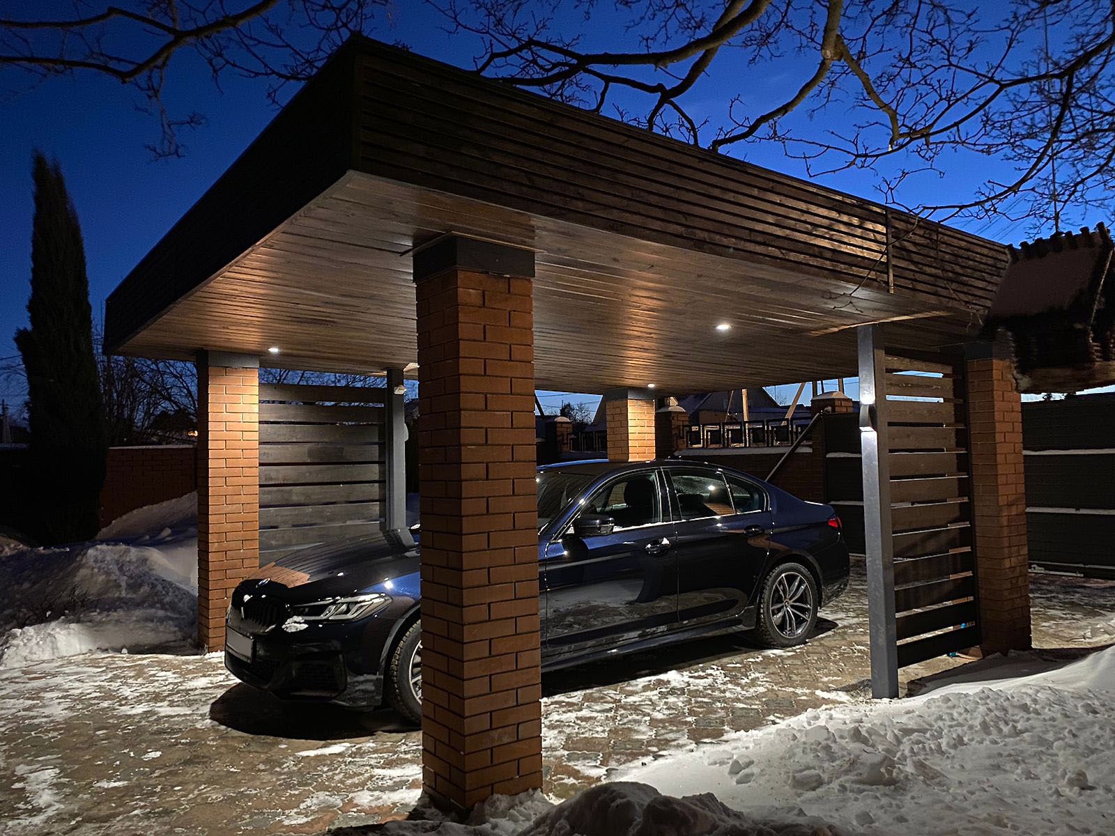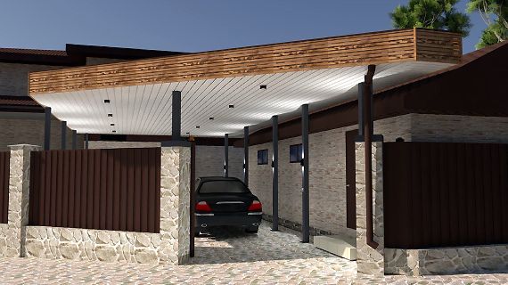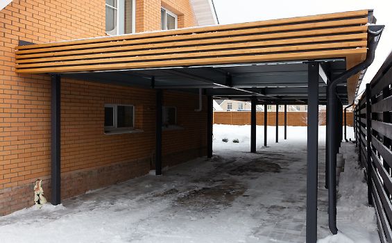 Чтобы пройти от машины до дома по чистой сухой брусчатке и не промокнуть под ливнем, достаточно продлить навес до крыльца. Важно грамотно спланировать конструкцию и дизайн, чтобы накрыть нужную площадь, сделать примыкание к дому и сохранить красивый фасад.