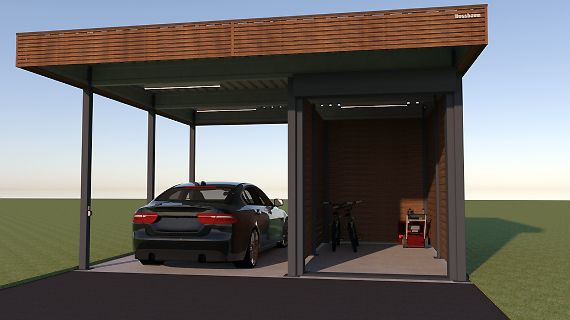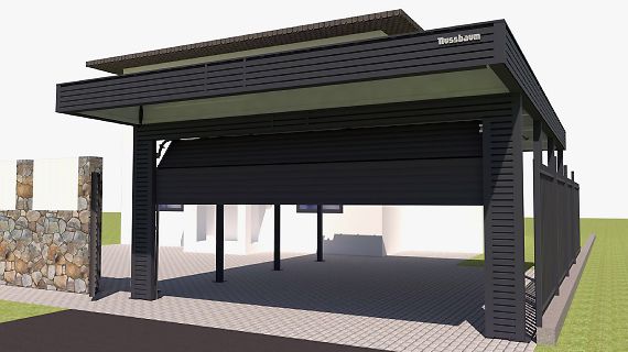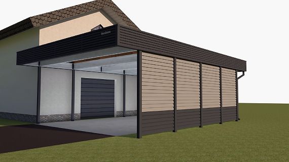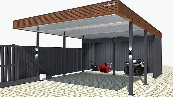 Для хранения садового инвентаря, велосипедов или мототехники необходимо помещение. Чтобы оно не выглядело как сарай и не портило общий вид логично вписать его в конструкцию навеса. Также можно организовать теплый гараж, хотя опыт наш и наших Заказчиков показывает, что гараж не очень подходит для повседневного использования, особенно в нашем климате. Чаще теплые хозблоки оборудуют под мастерские или даже тренажерные.