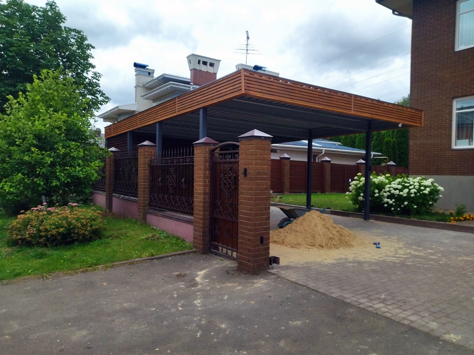 Навес не обязательно должен быть прямоугольным, а заборы перпендикулярными. Повторение конструкцией навеса контуров участка позволяет органично оформить фасадную часть забора без выступающих или открытых углов.