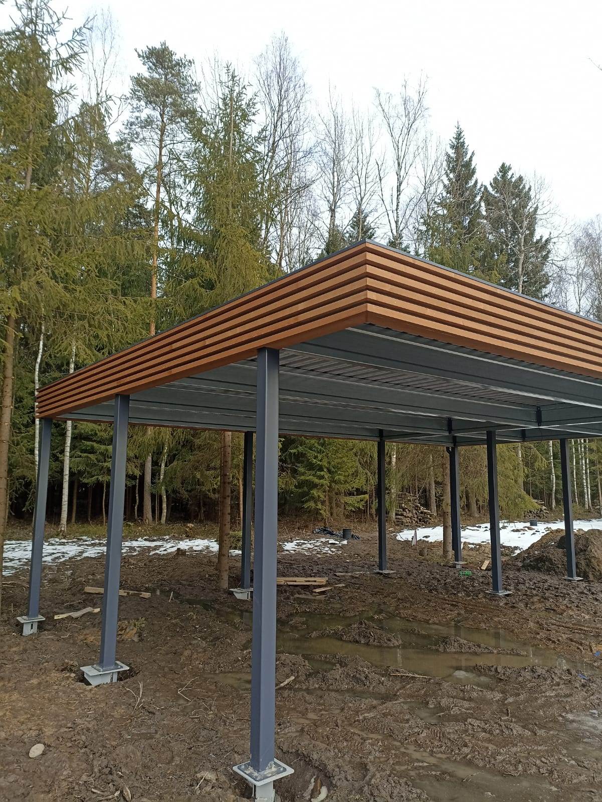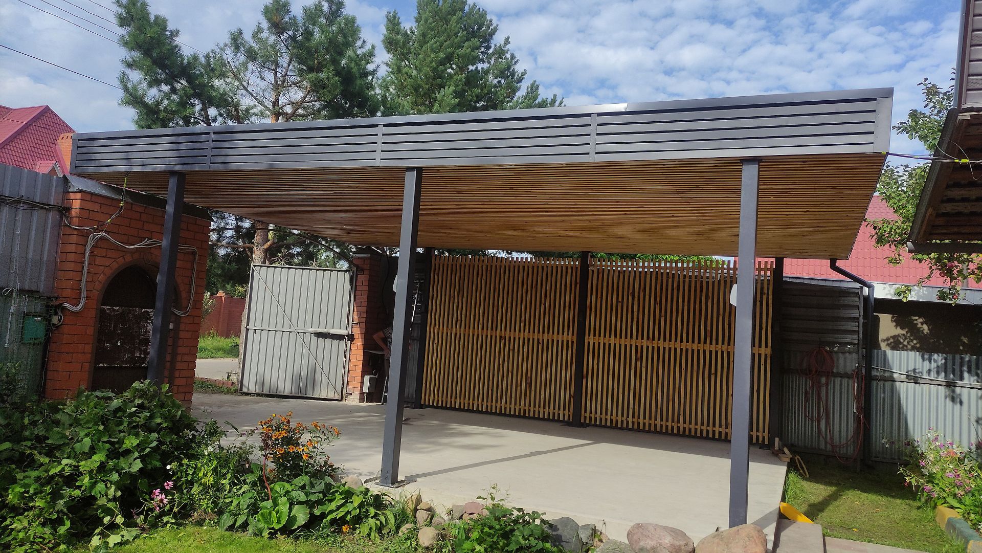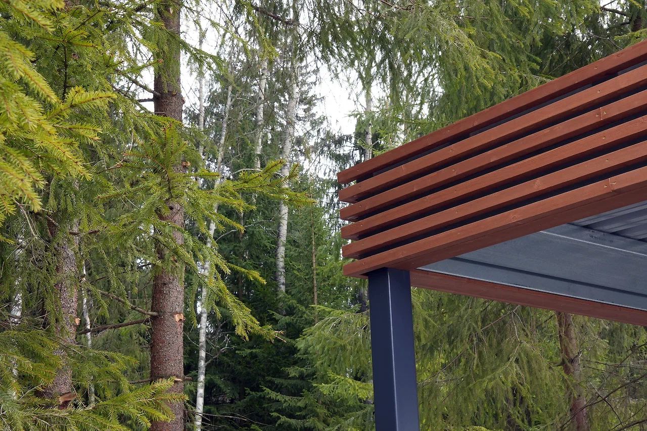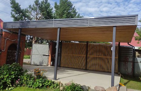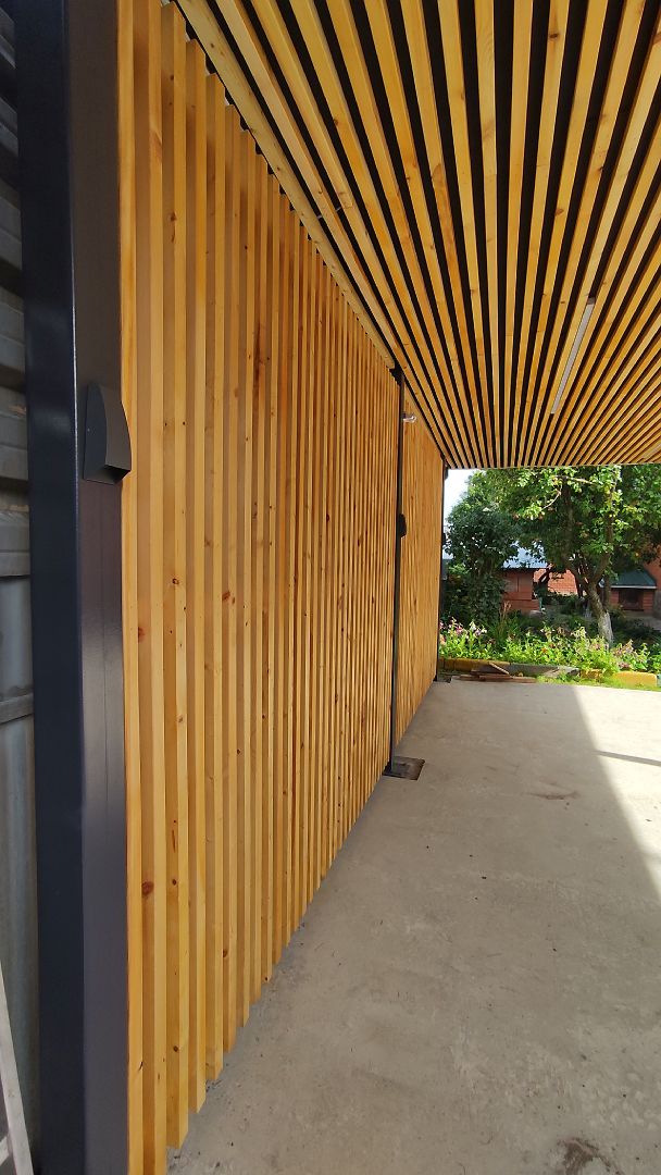 Ленинградская область. 10,4х6,8 м. Обшивка фриза и хозблока металлическими ламелями. Идеальные линии, интересные цвета, потолок из термососны. Получился очень красивый и стильный навес!