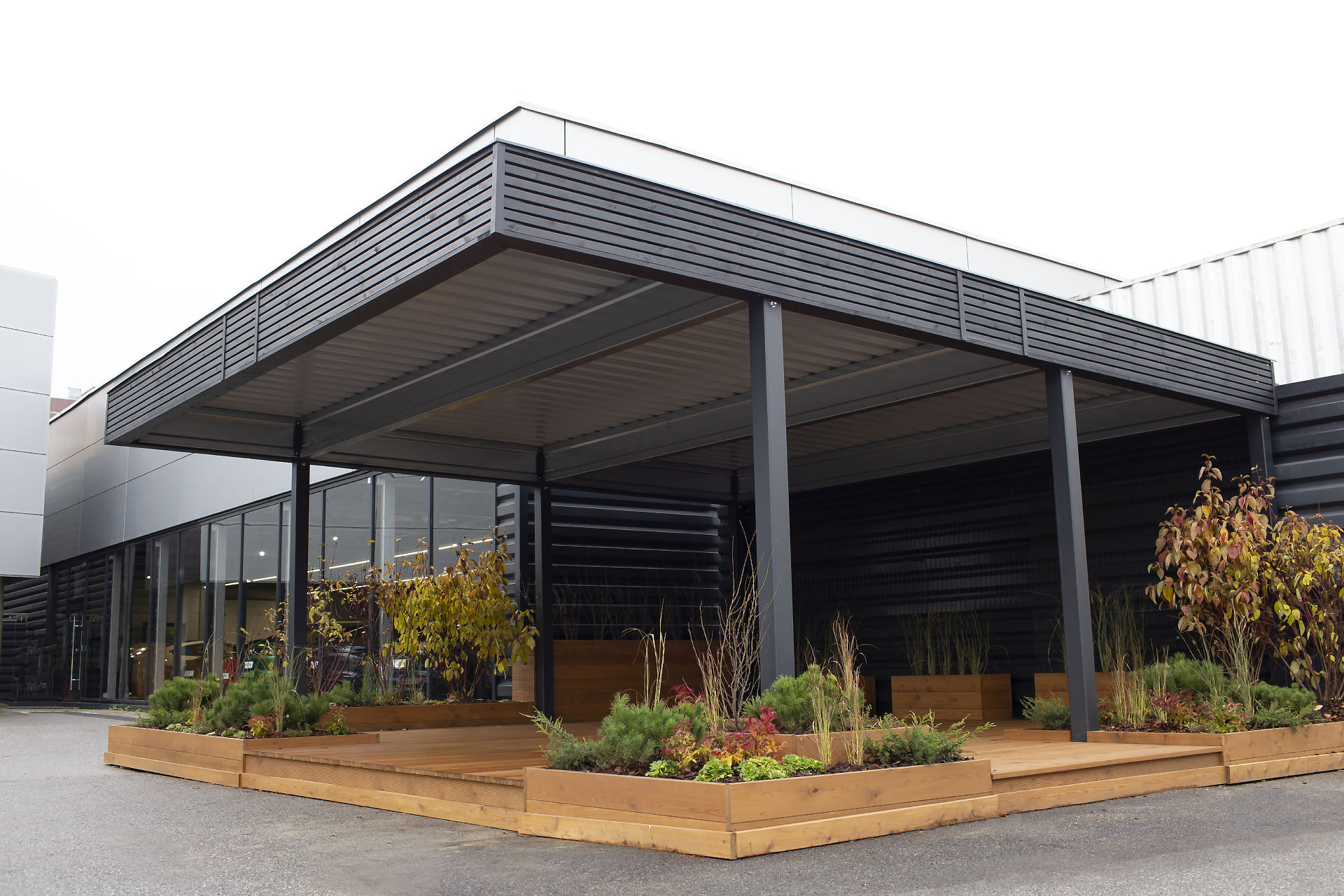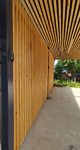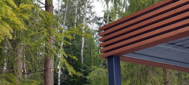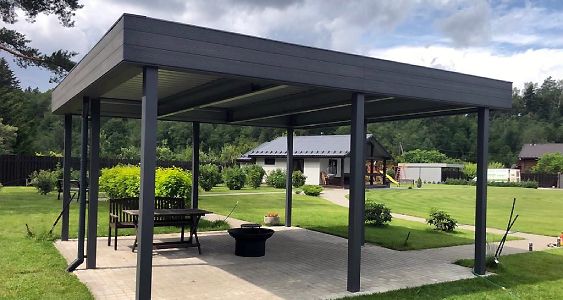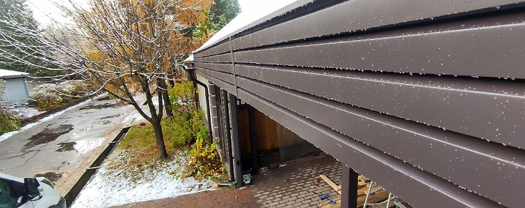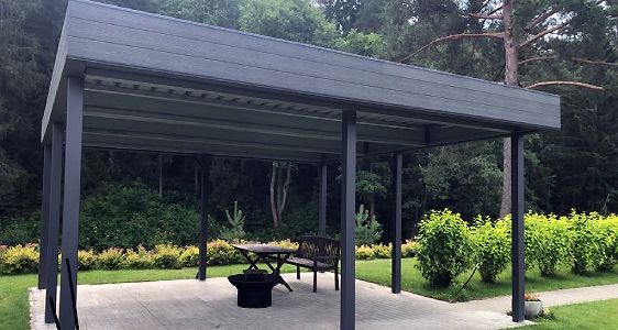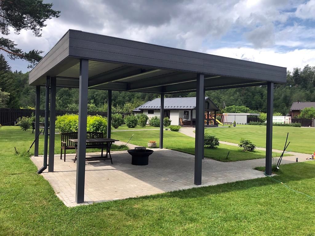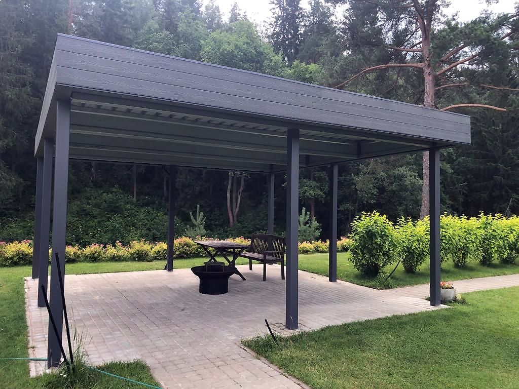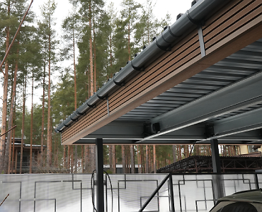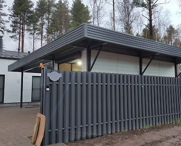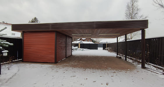 Ленинградская область. 10,4х6,8 м. Обшивка фриза и хозблока металлическими ламелями. Идеальные линии, интересные цвета, потолок из термососны. Получился очень красивый и стильный навес!