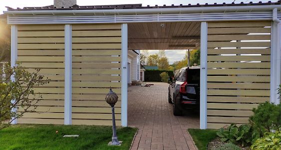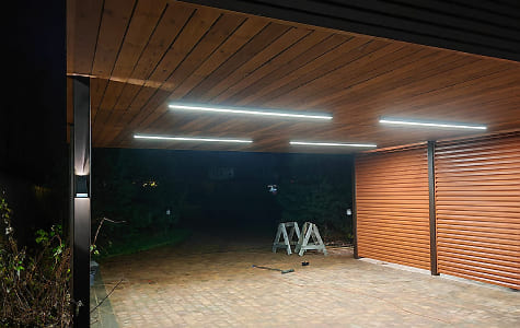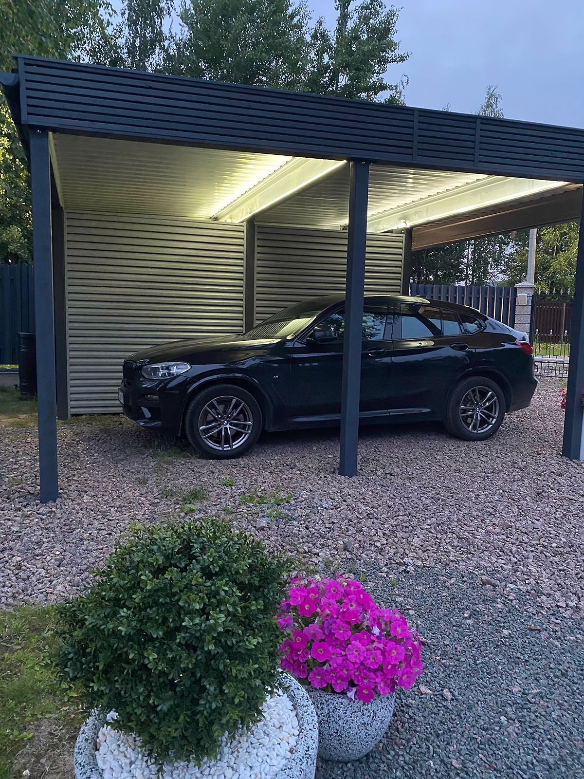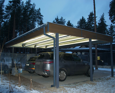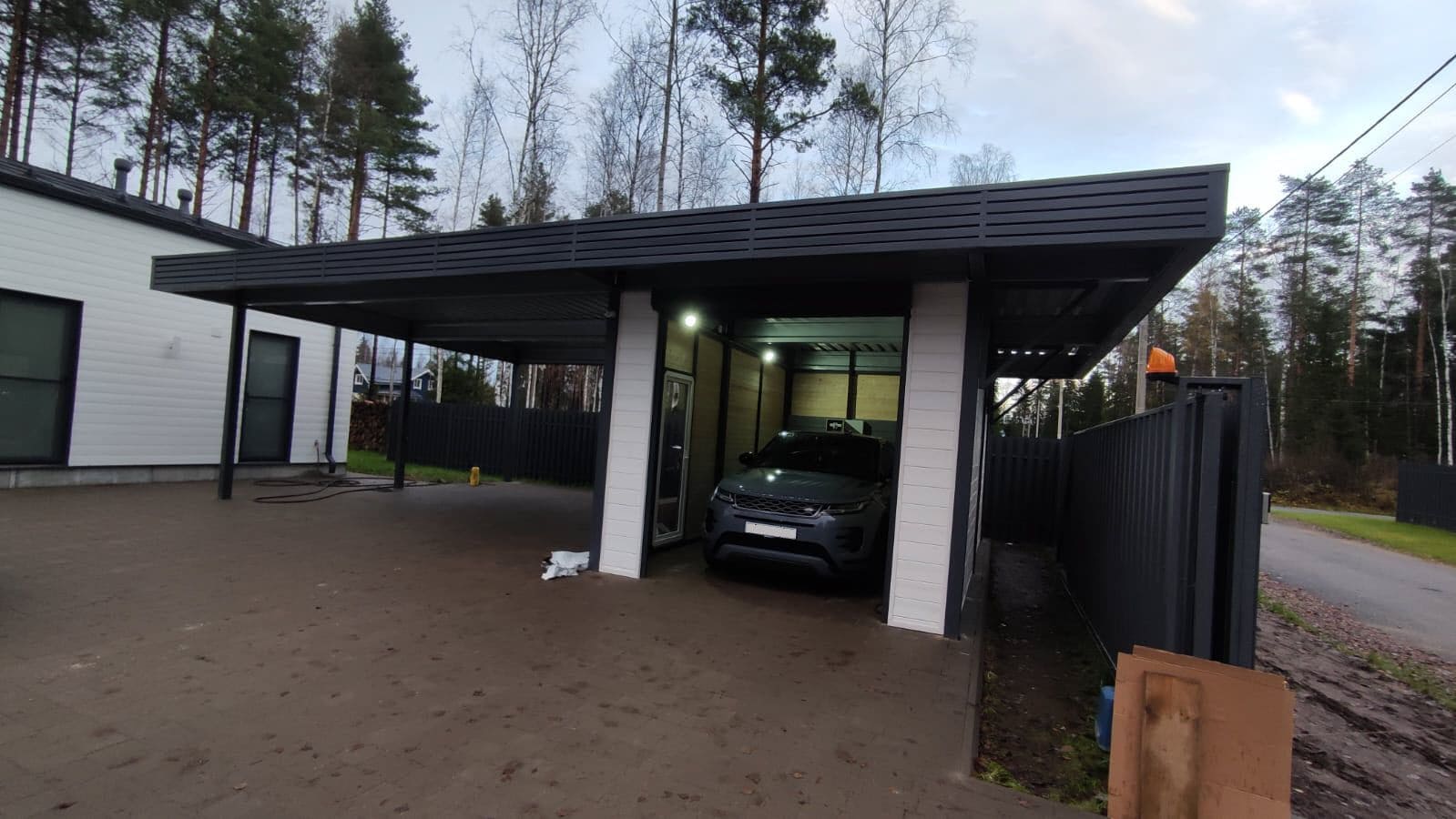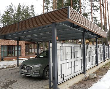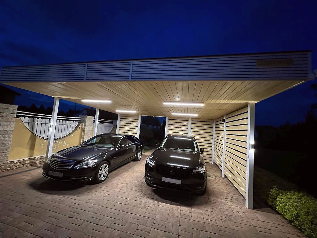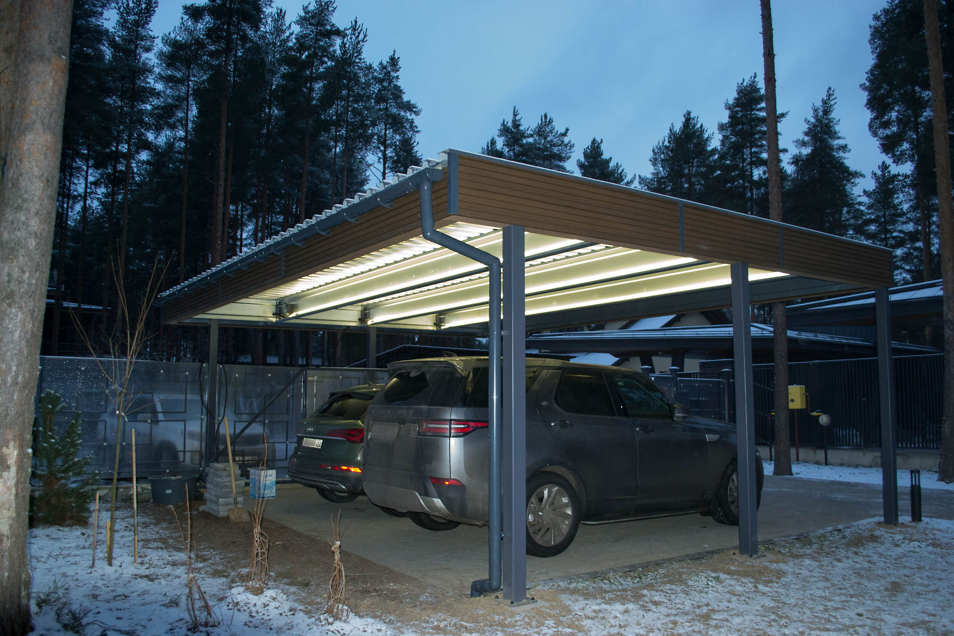 Ленинградская область. Навес 7,5х6 м, интегрированный в забор, с дополнительным боковым свесом. Интересное решение по отделке фриза ДПК панелями со скрытым крепежом. Фоновое освещение парковочной зоны, дающее мягкий отраженный свет.