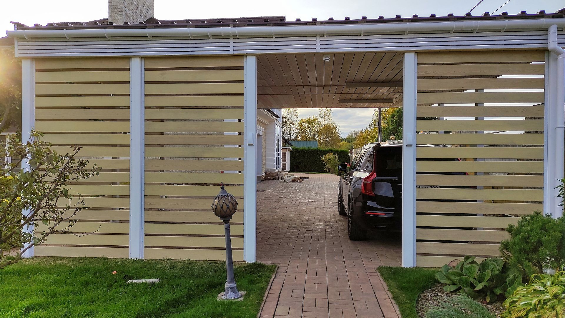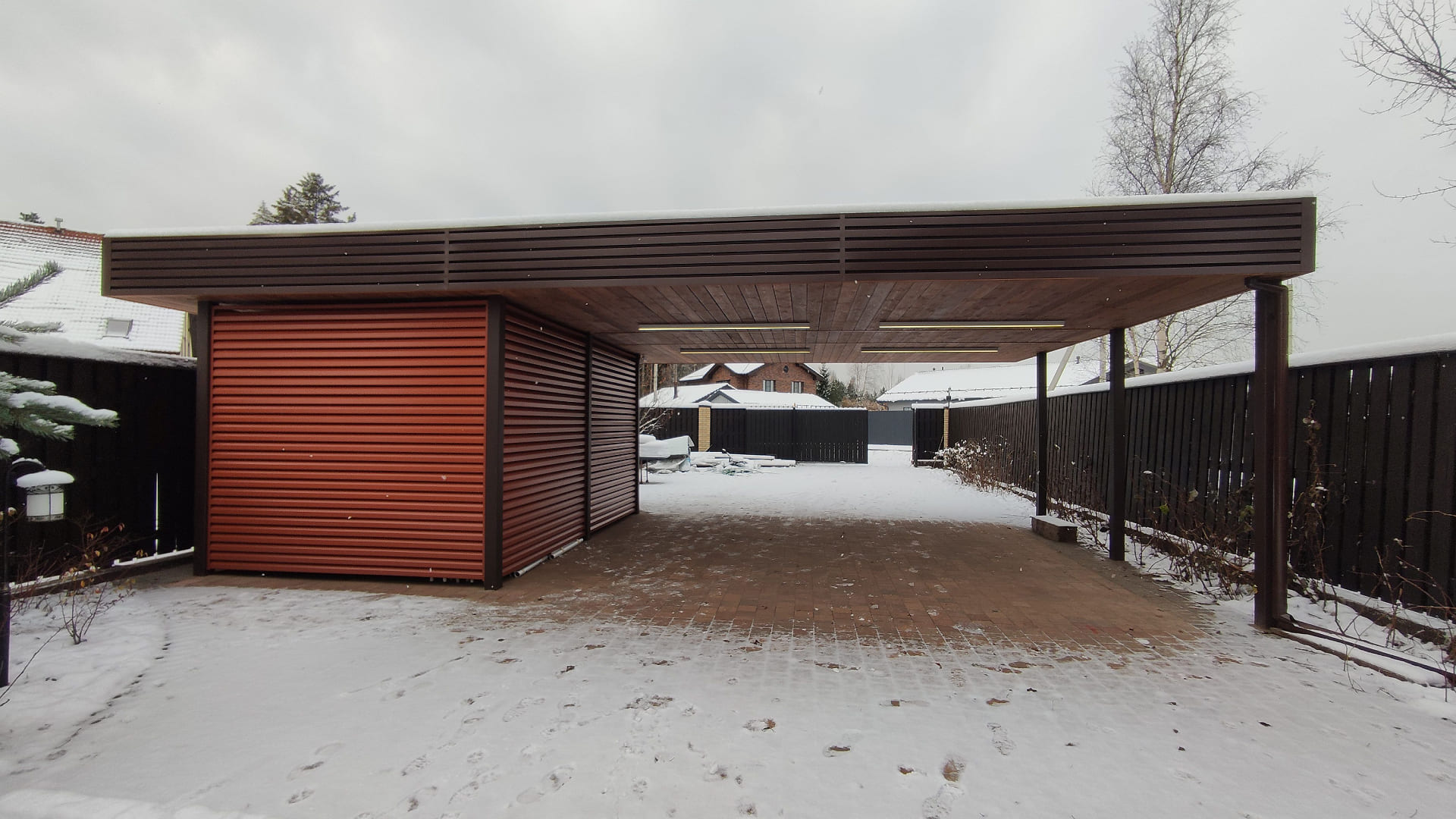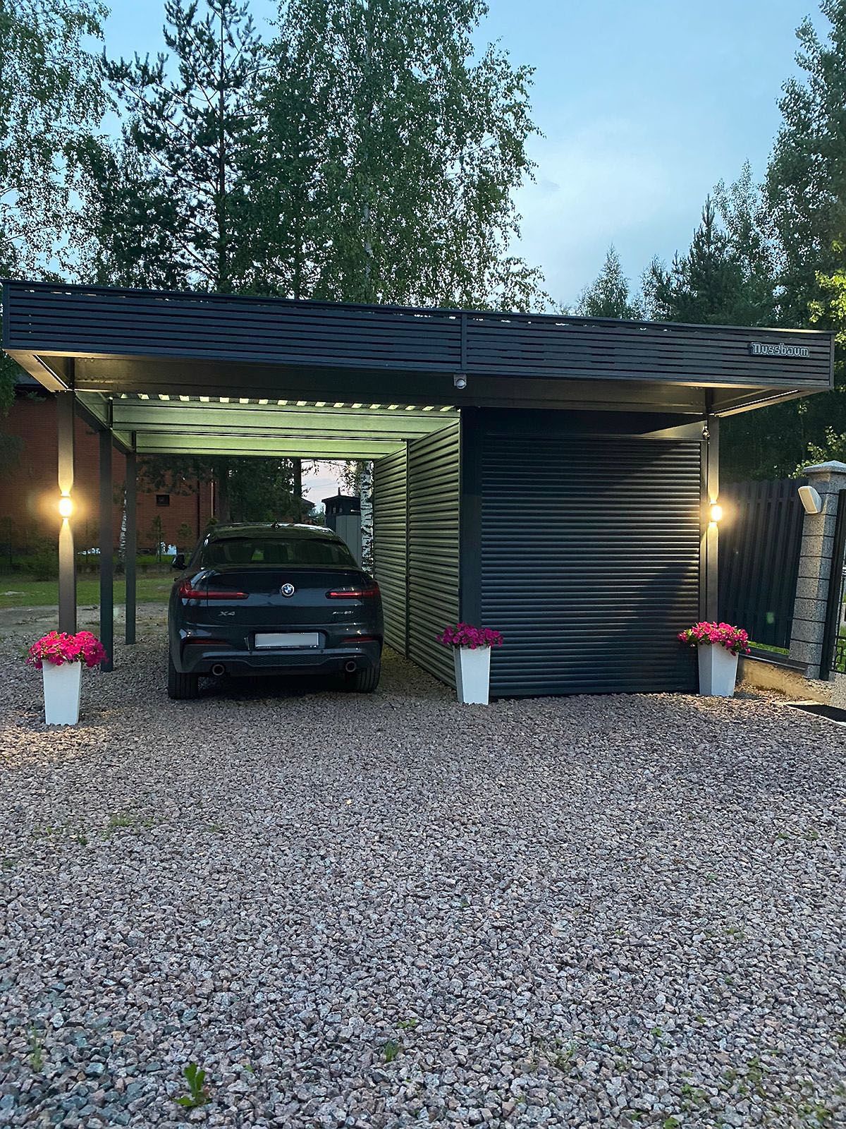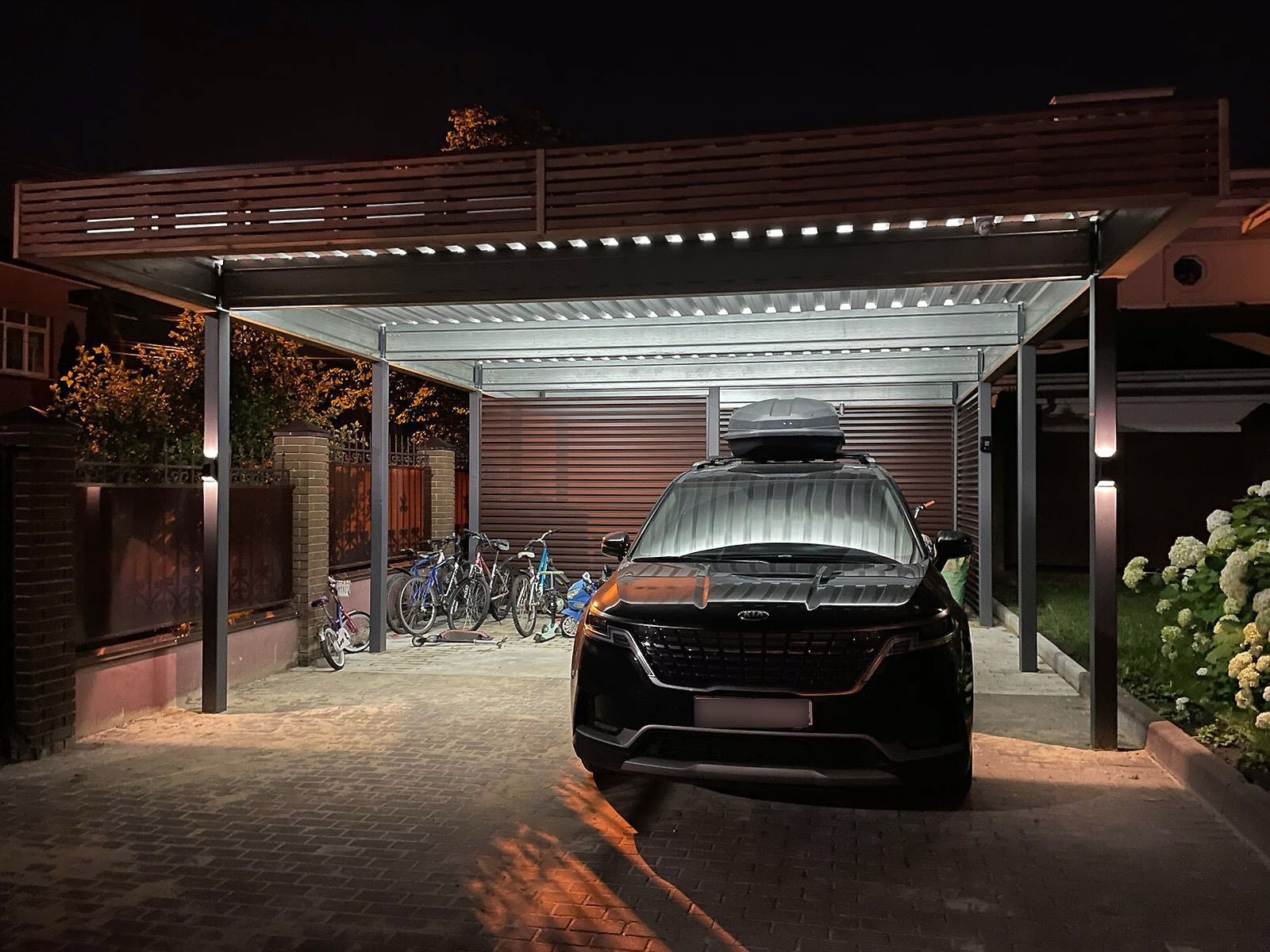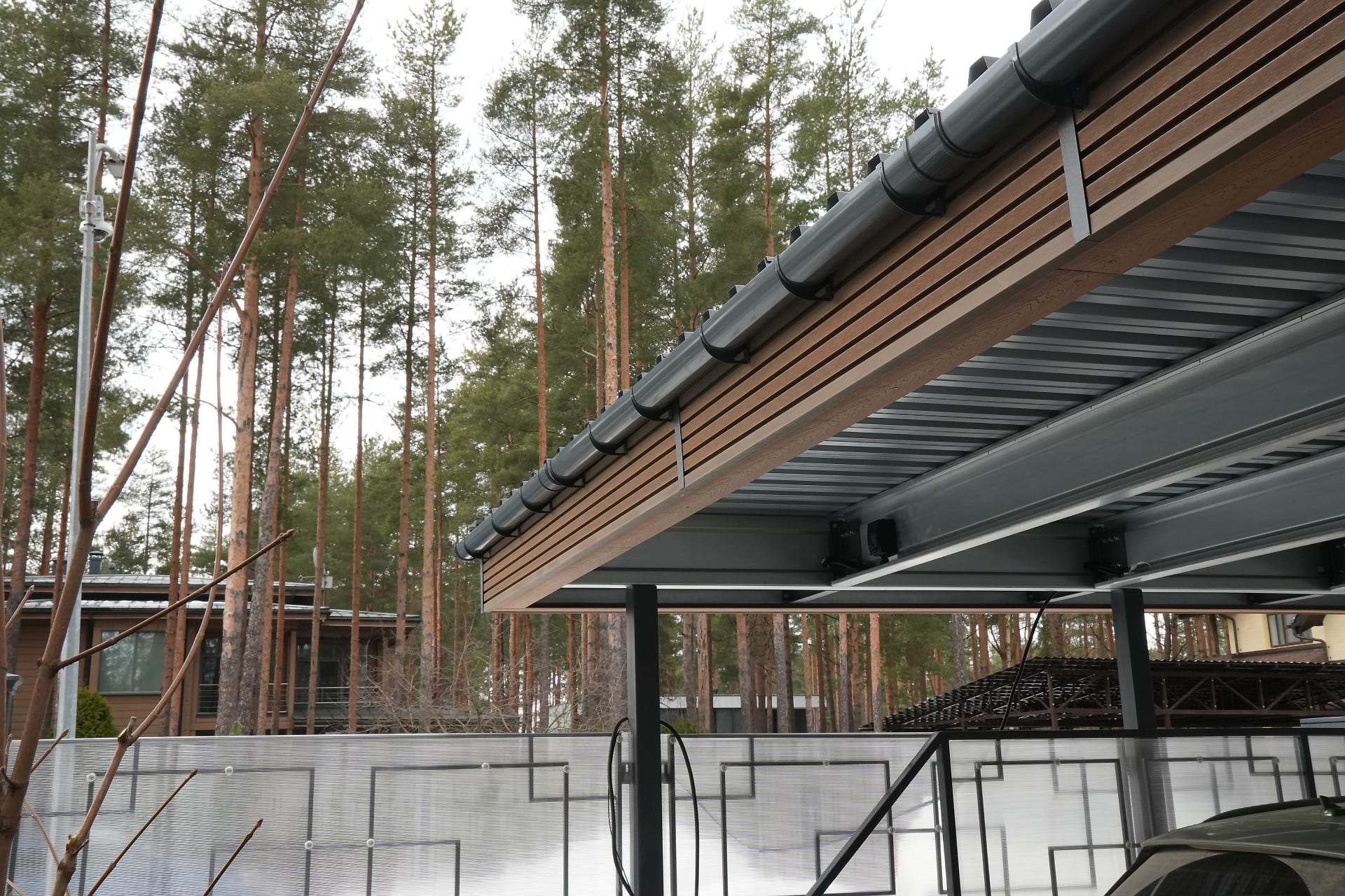 Ленинградская область. Навес 7,5х6 м, интегрированный в забор, с дополнительным боковым свесом. Интересное решение по отделке фриза ДПК панелями со скрытым крепежом. Фоновое освещение парковочной зоны, дающее мягкий отраженный свет.
