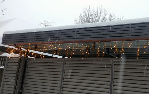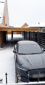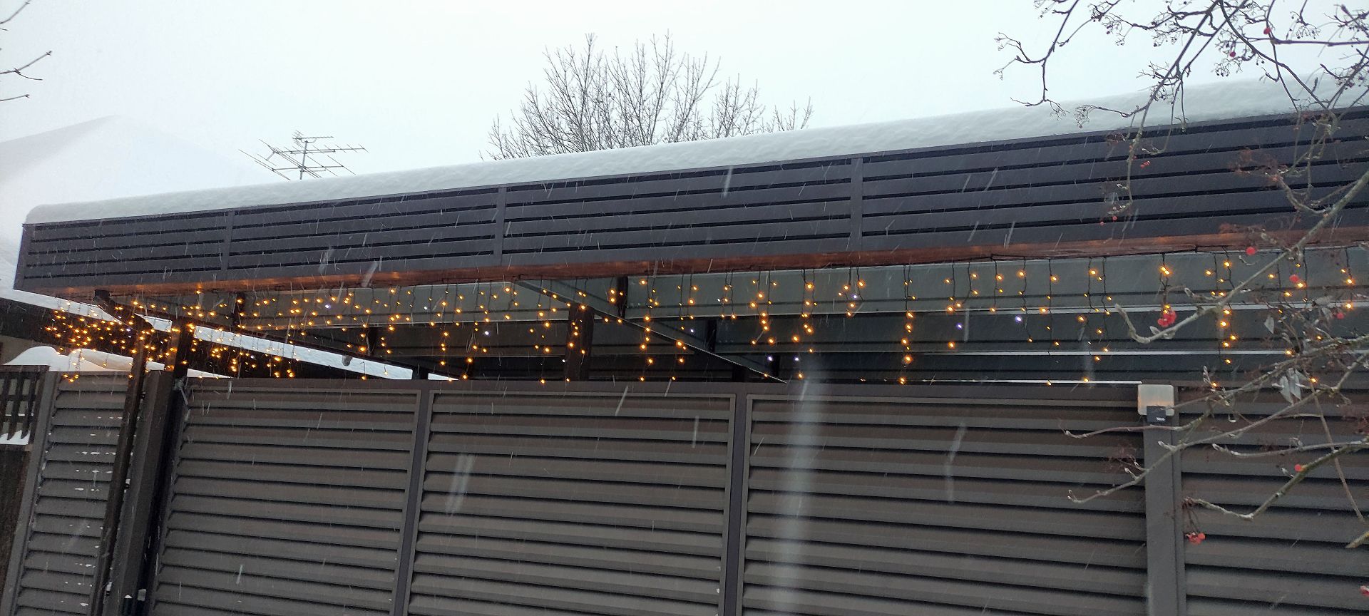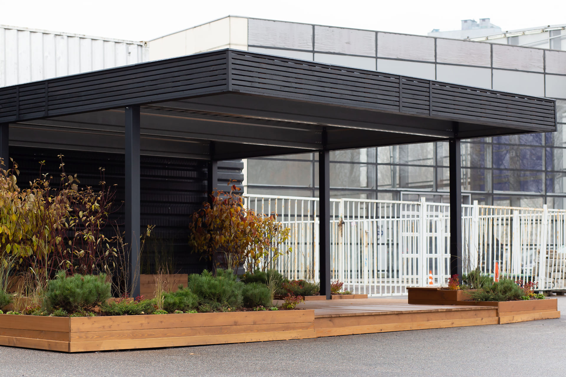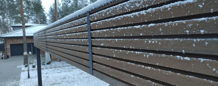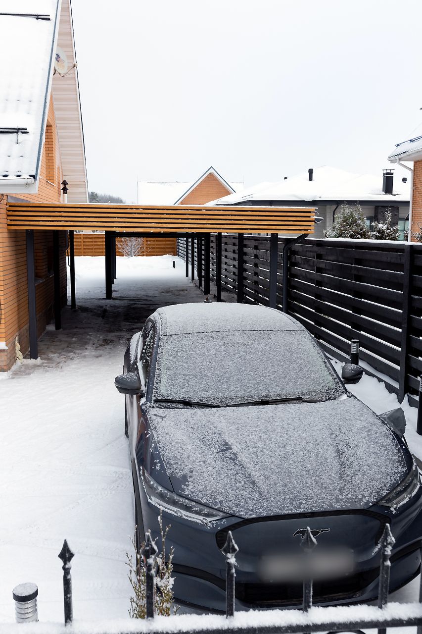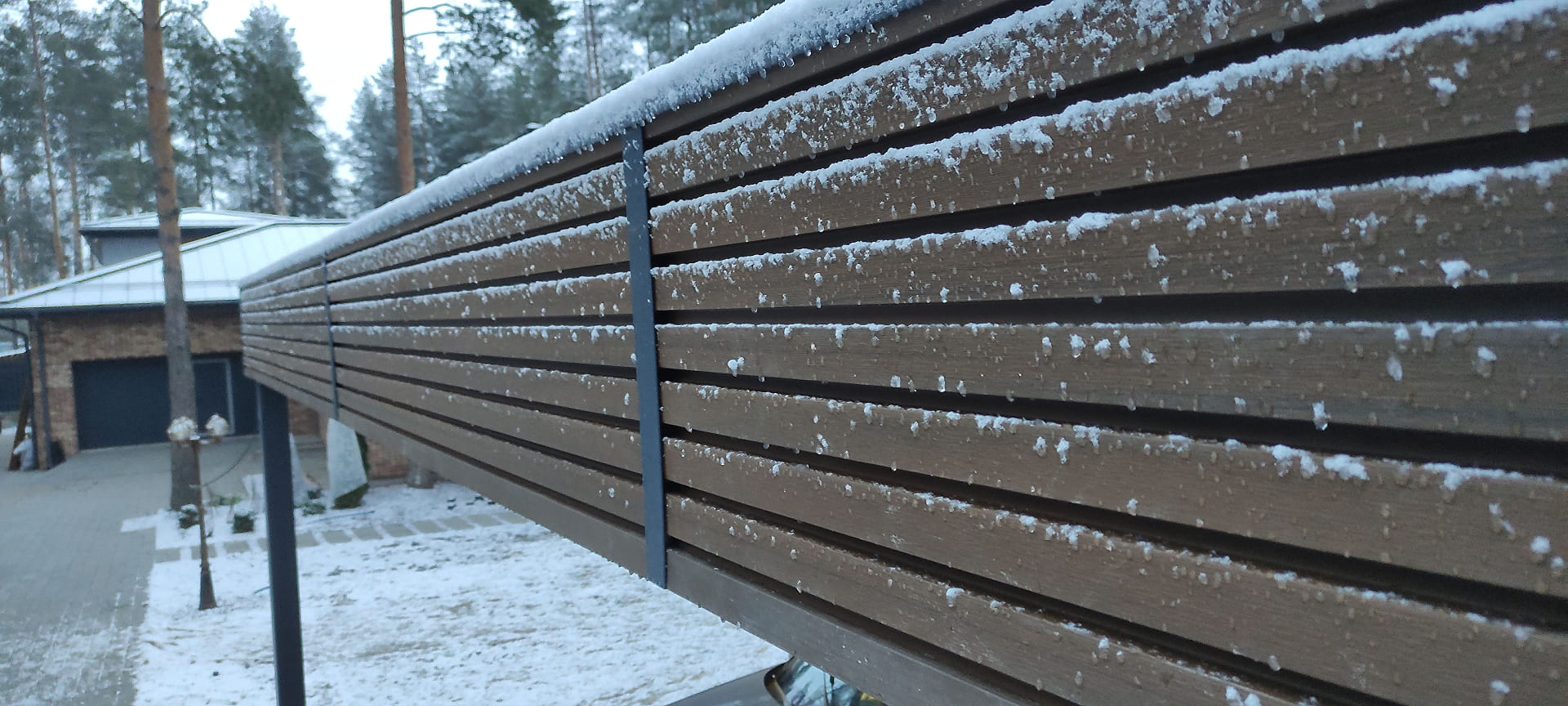 Ленинградская область. Навес 7,5х6 м, интегрированный в забор, с дополнительным боковым свесом. Интересное решение по отделке фриза ДПК панелями со скрытым крепежом. Фоновое освещение парковочной зоны, дающее мягкий отраженный свет.