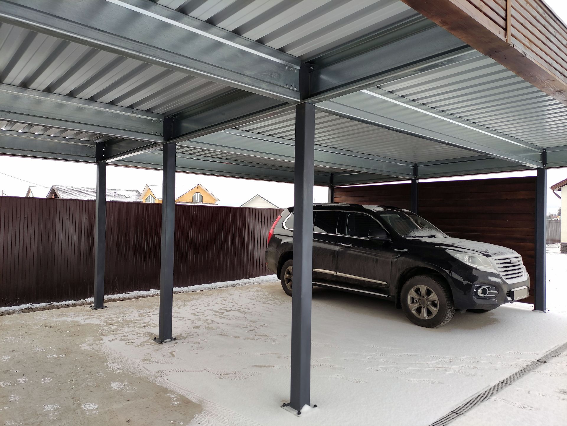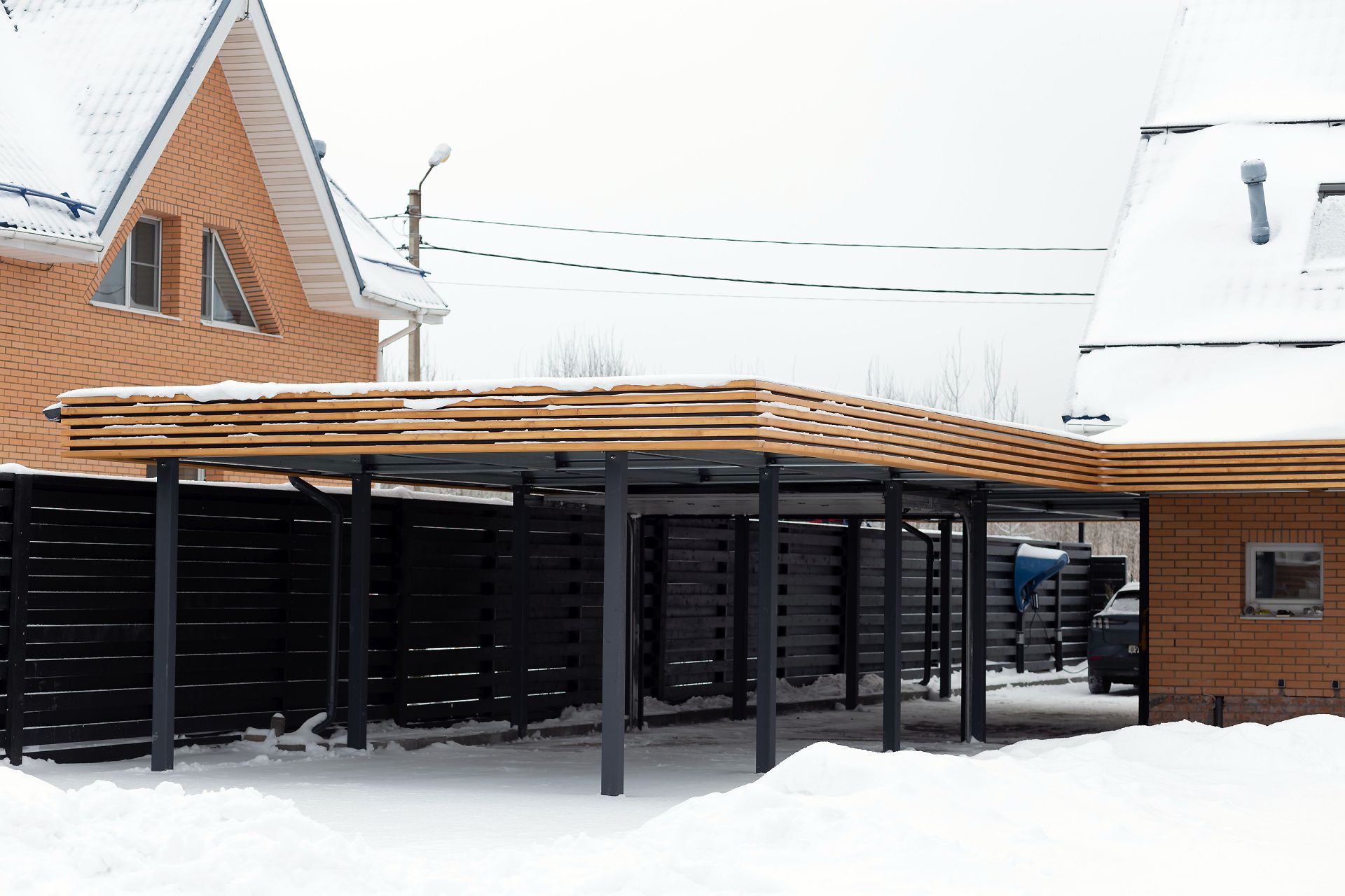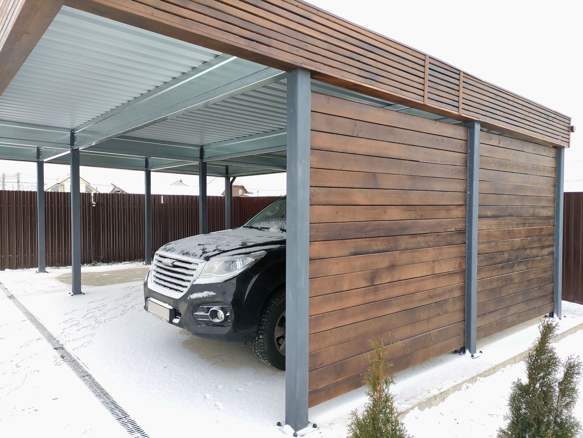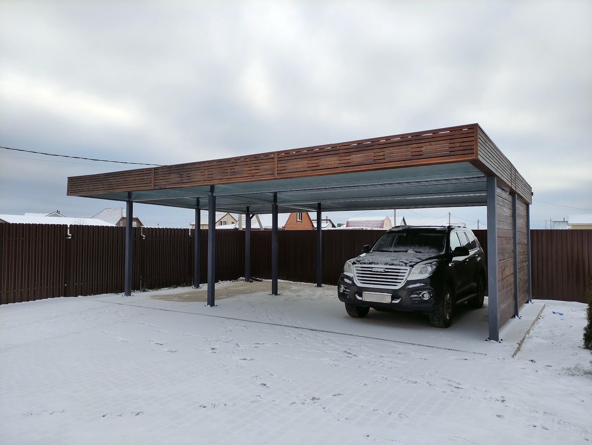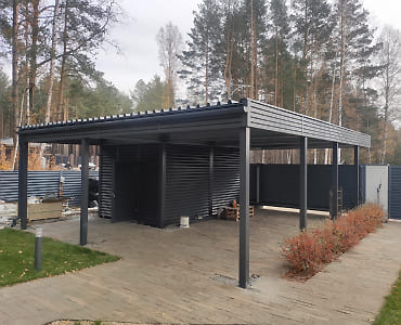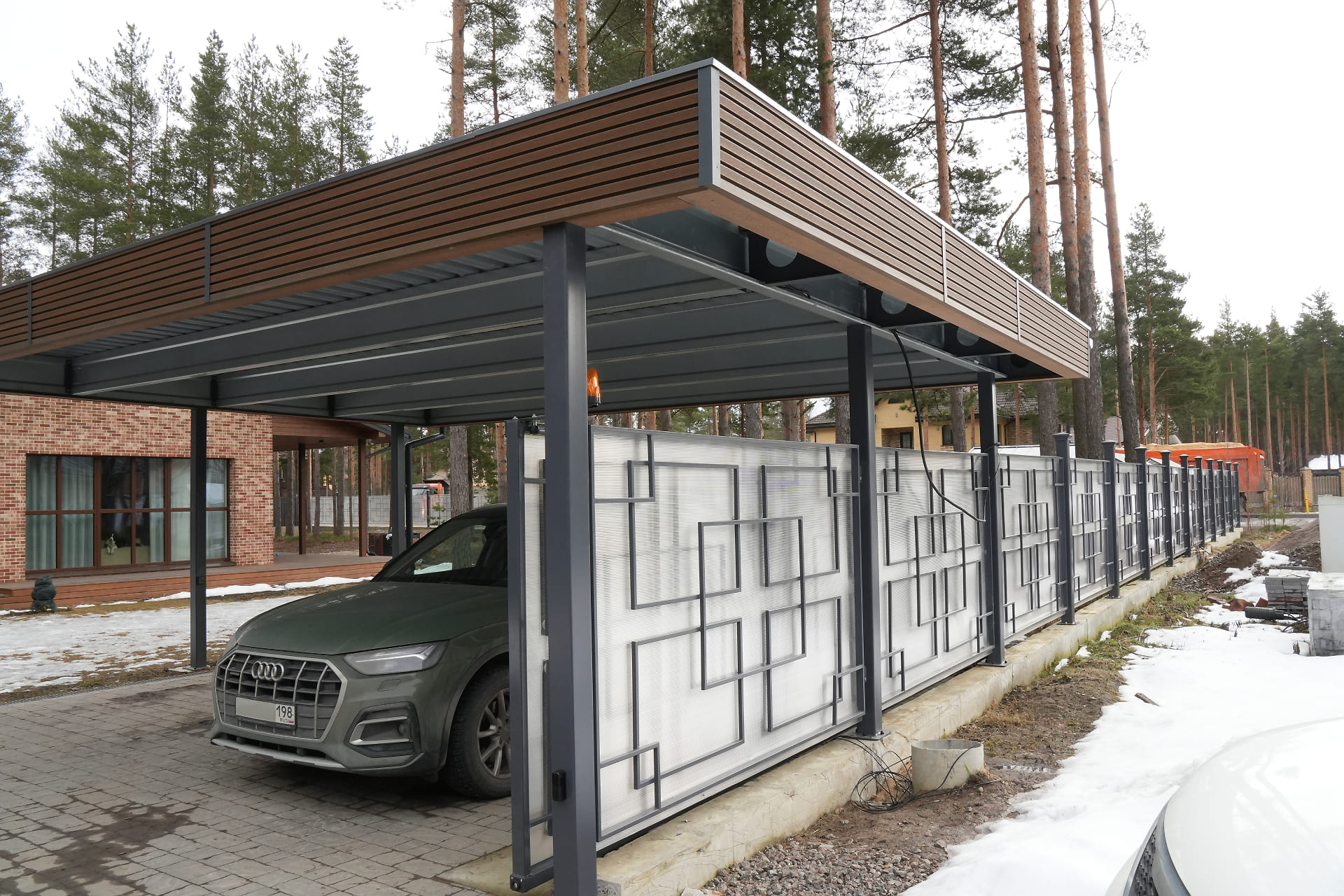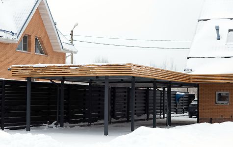 Свердловская область. Навес 7,5х9,2 закрывает всю парковочную площадку перед домом. Фриз из металлических ламелей, хозблок обшит жалюзи в едином стиле с забором.