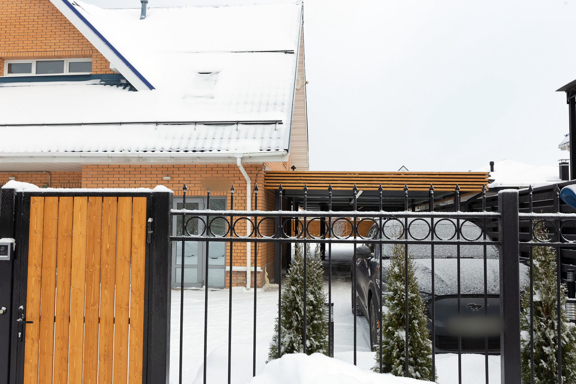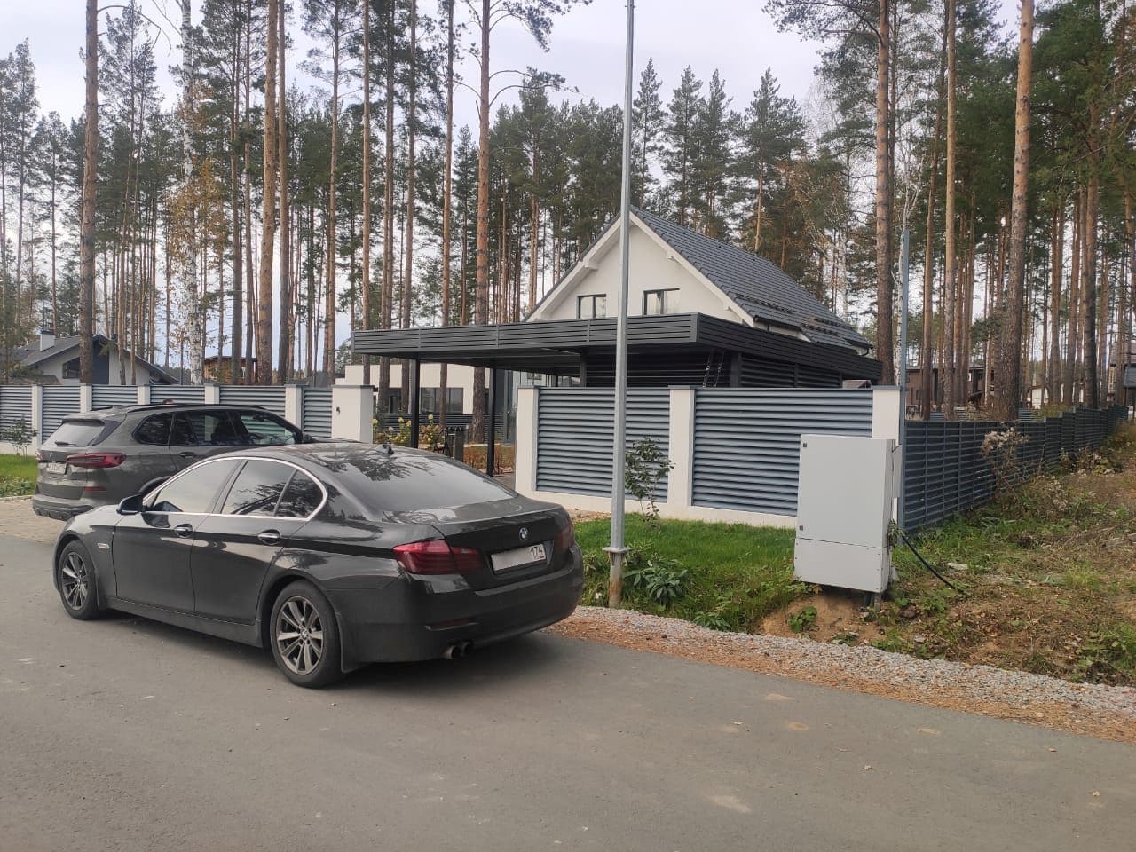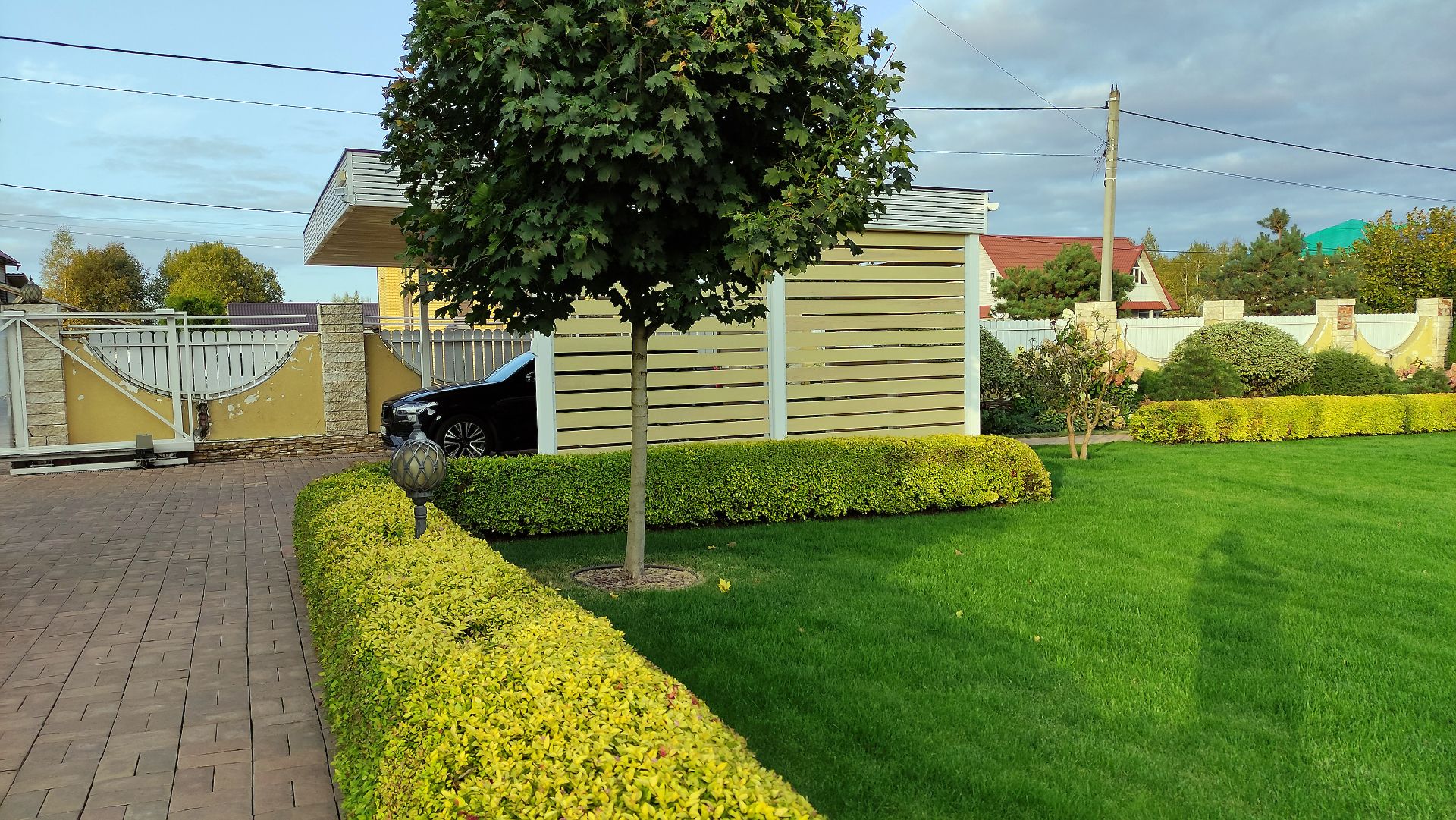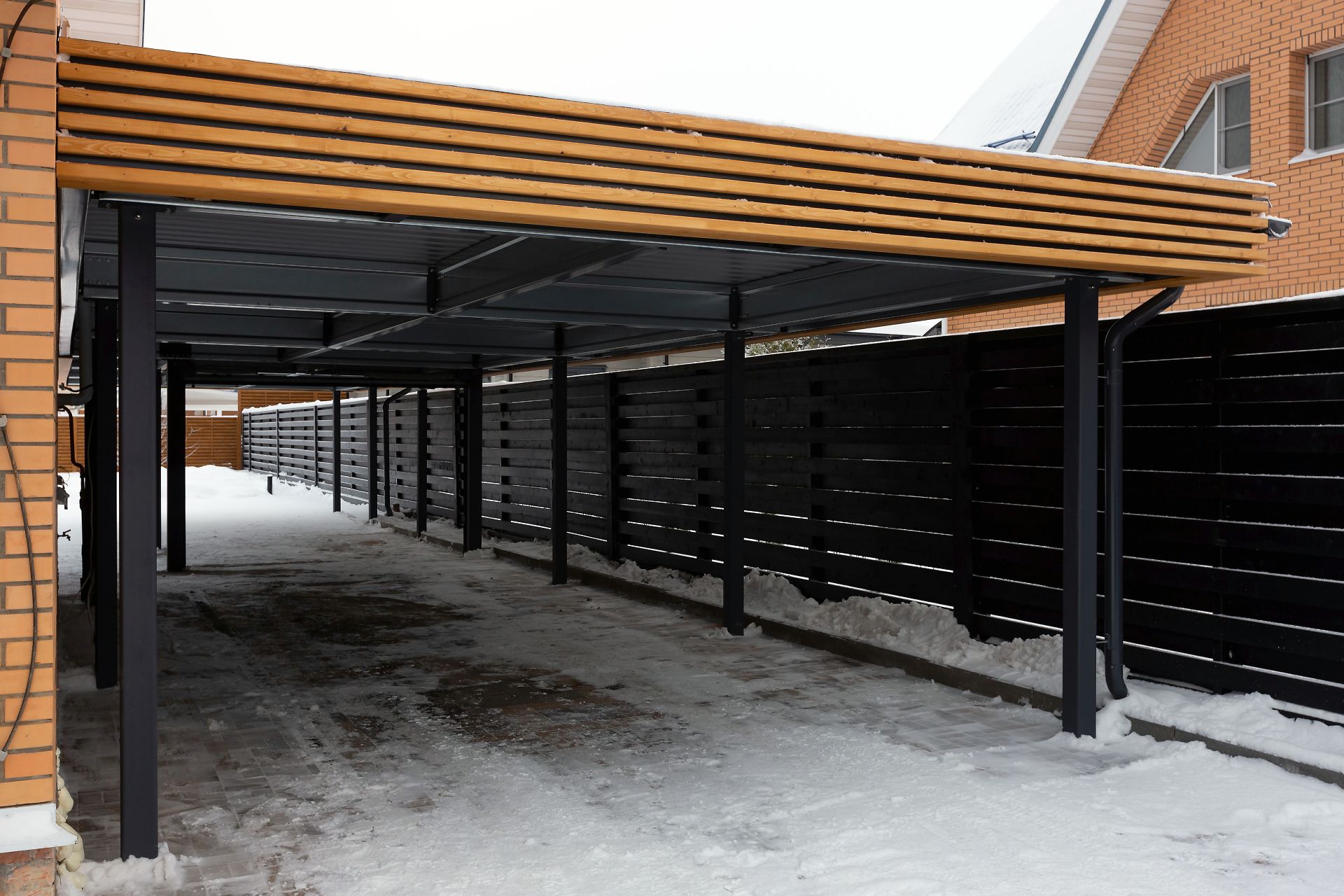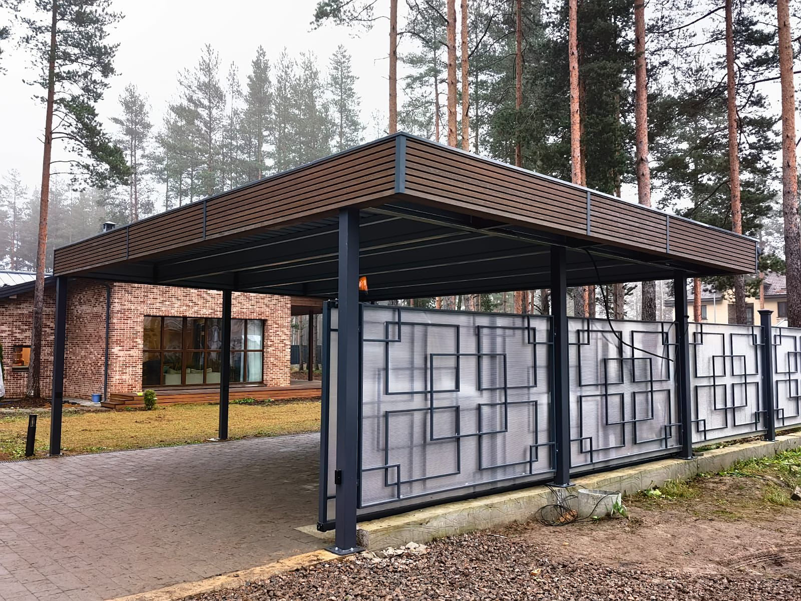 Свердловская область. Навес 7,5х9,2 закрывает всю парковочную площадку перед домом. Фриз из металлических ламелей, хозблок обшит жалюзи в едином стиле с забором.