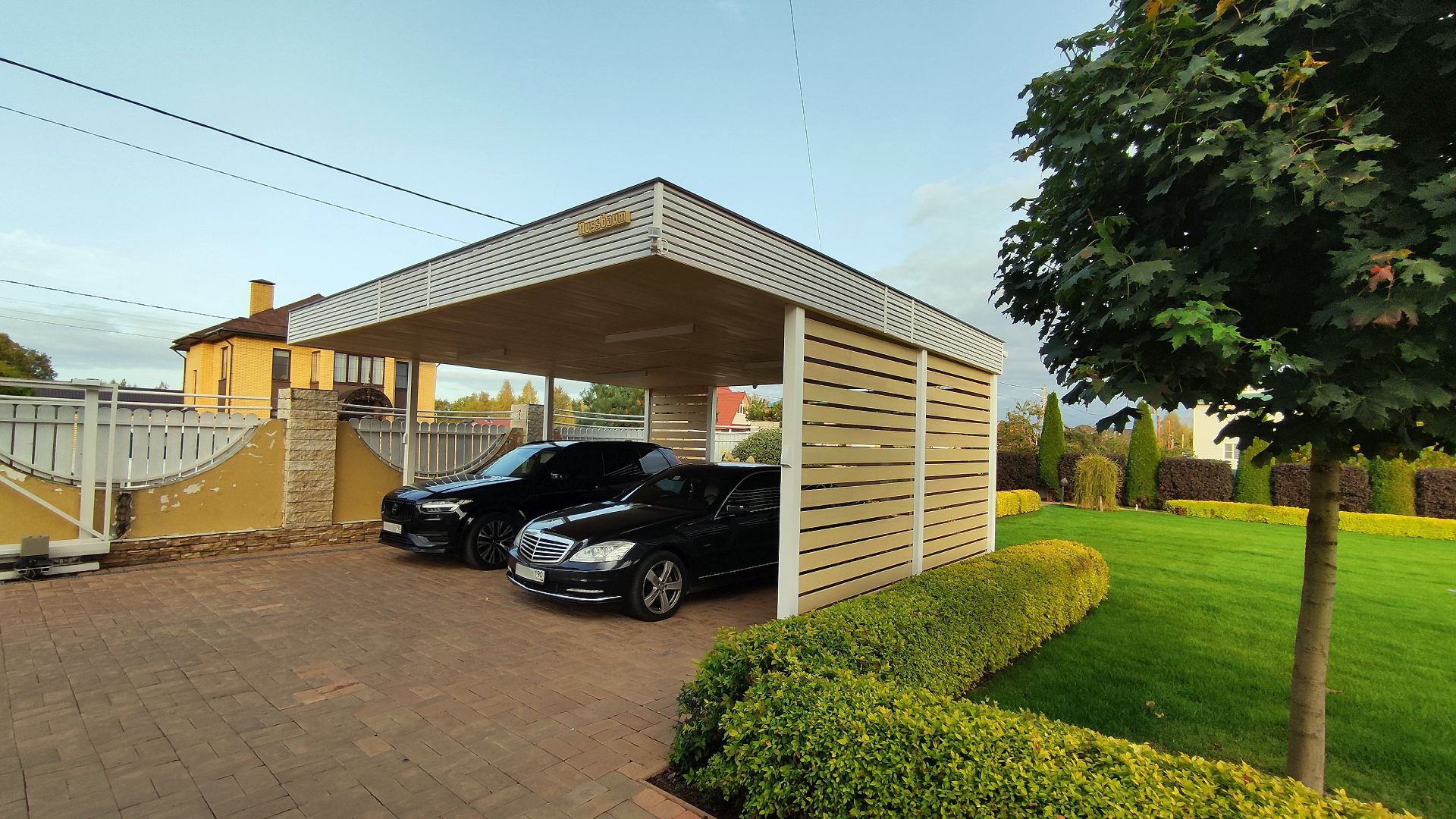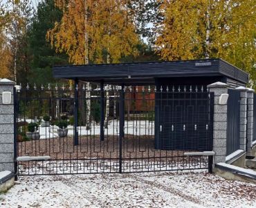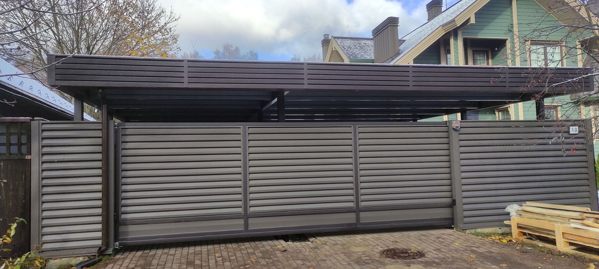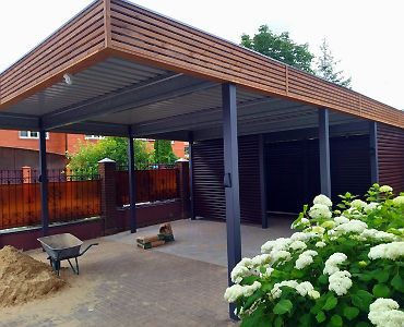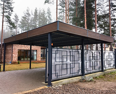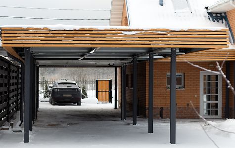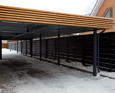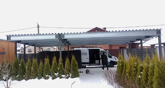 Москва. Стильный навес 9,2х7,8 с металлическим фризом органично сочетается с въездной группой и забором-жалюзи.