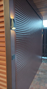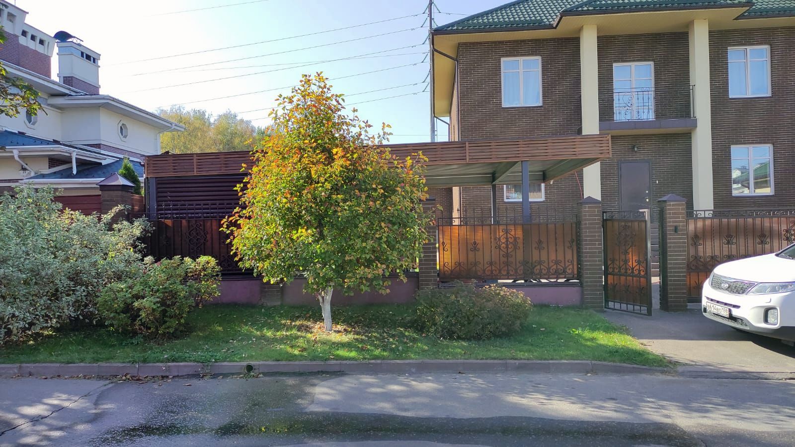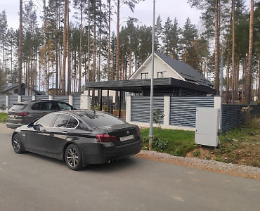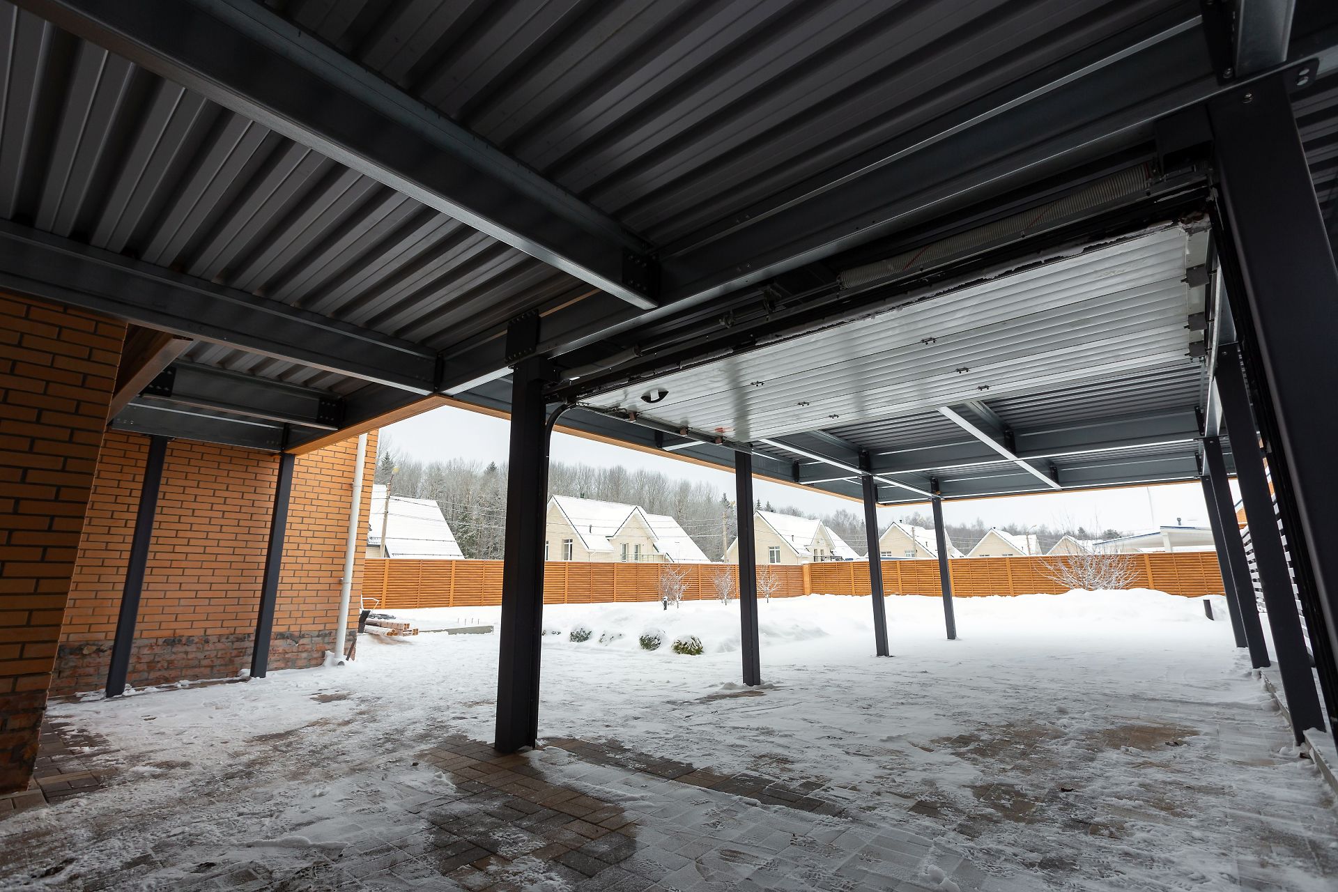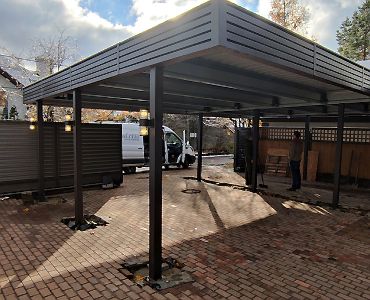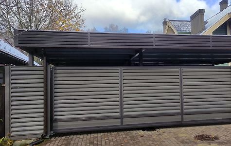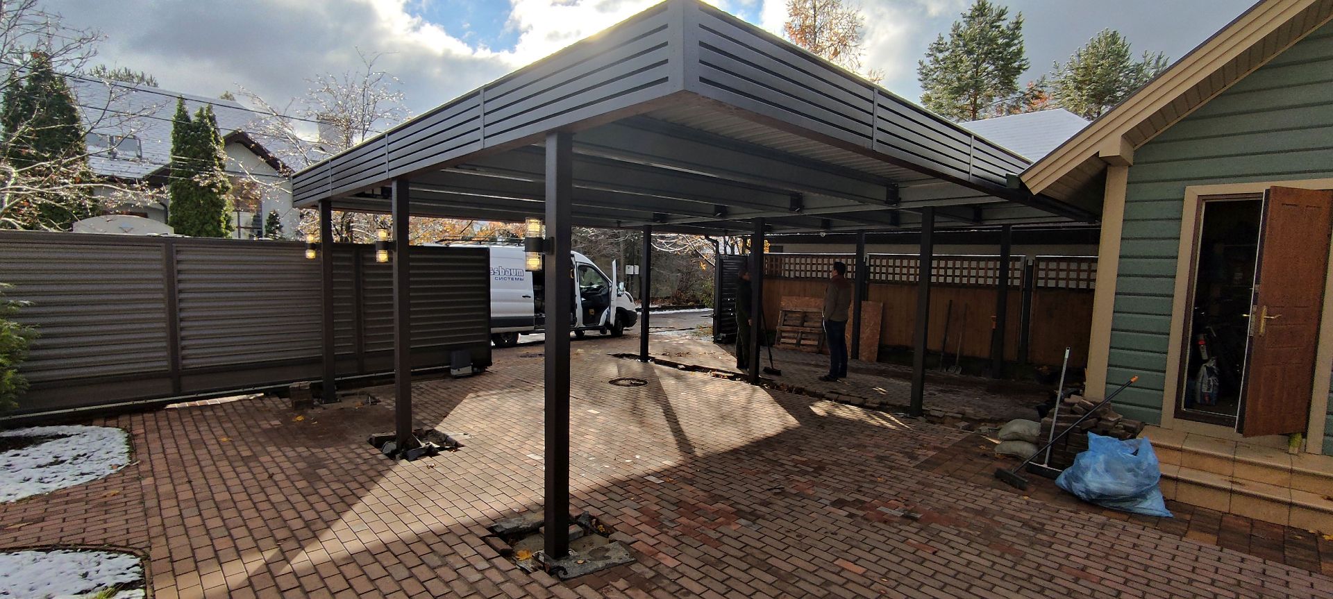 Москва. Стильный навес 9,2х7,8 с металлическим фризом органично сочетается с въездной группой и забором-жалюзи.