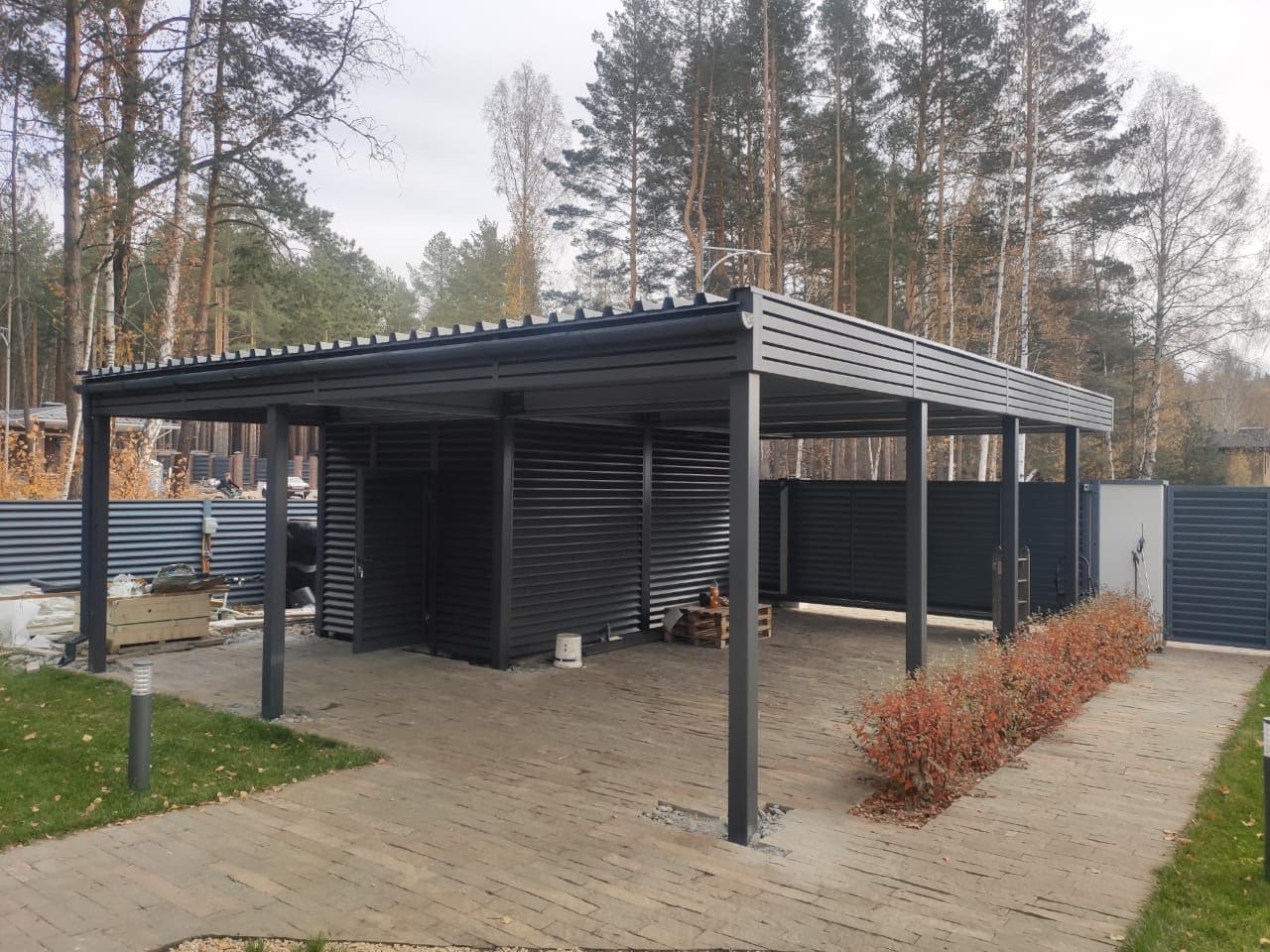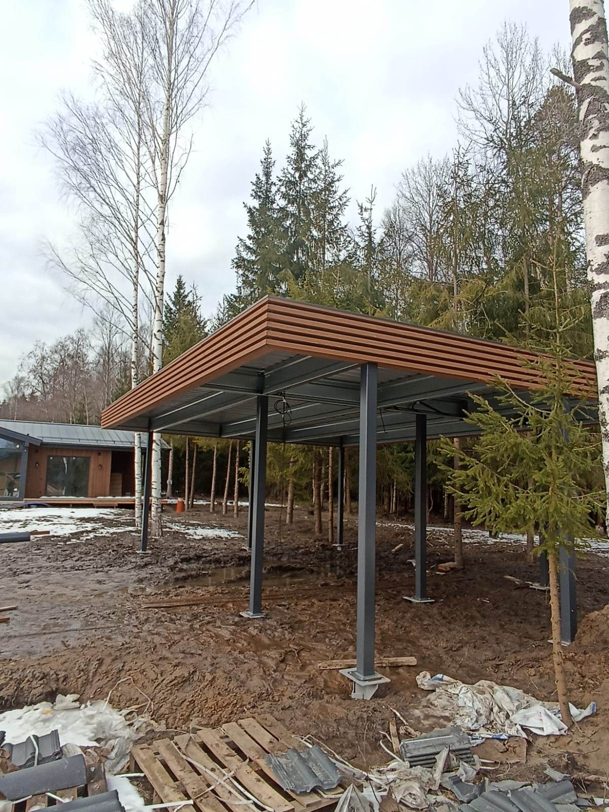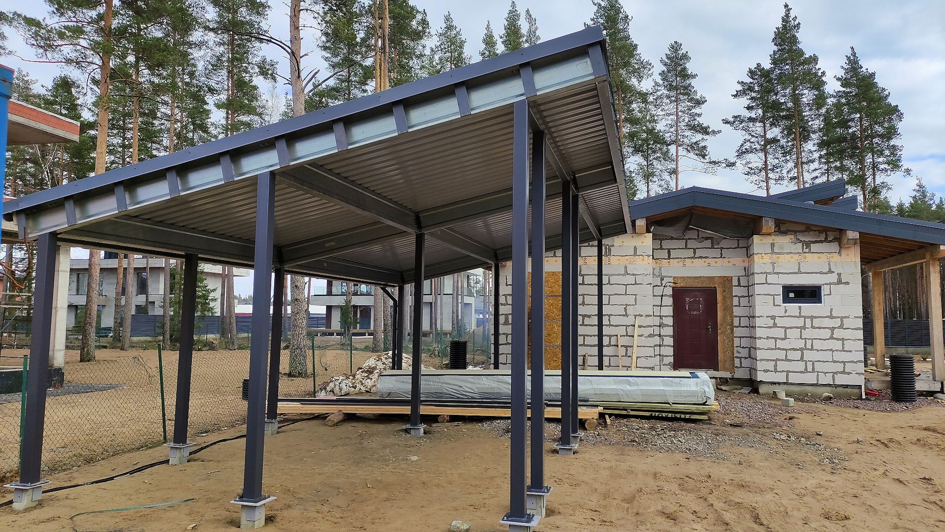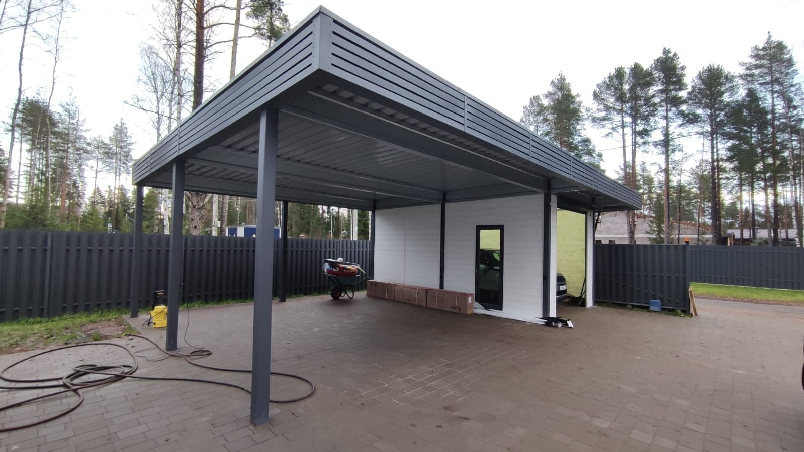 Ленинградская область. Навес 9.7 х 6.7 м на 2 места и хозблок. Стильная отделка фриза бруском, выкрашенным в цвет стен дома. Обшивку хозблока продолжим после ландшафтных работ и укладки брусчатки.
