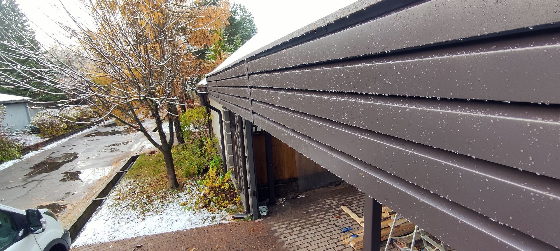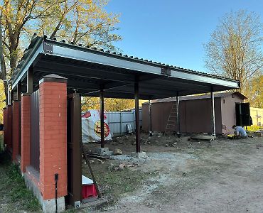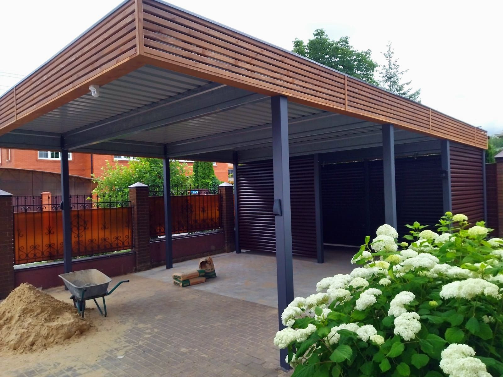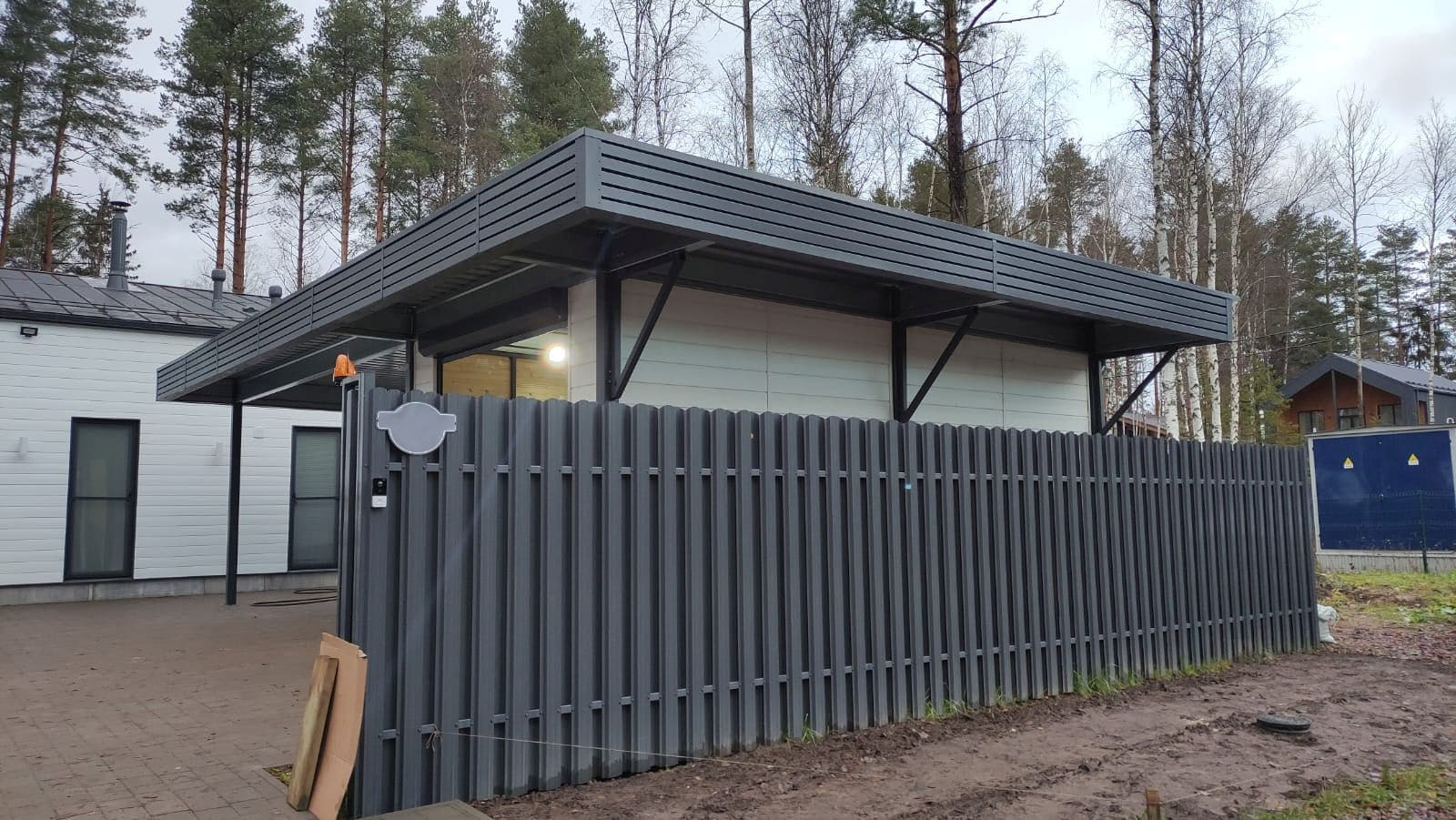 Ленинградская область. Навес 9.7 х 6.7 м на 2 места и хозблок. Стильная отделка фриза бруском, выкрашенным в цвет стен дома. Обшивку хозблока продолжим после ландшафтных работ и укладки брусчатки.
