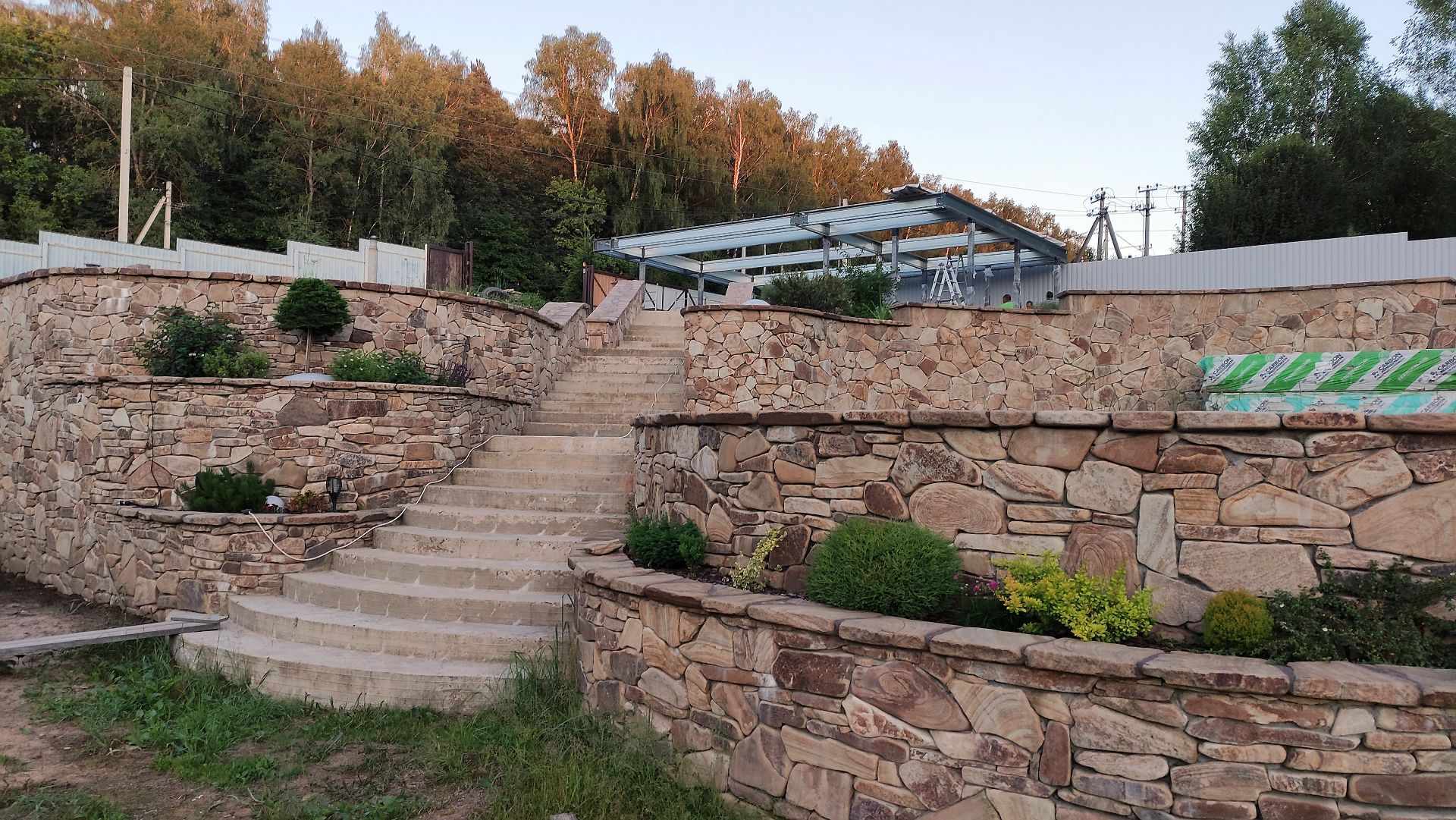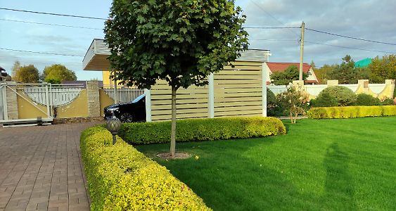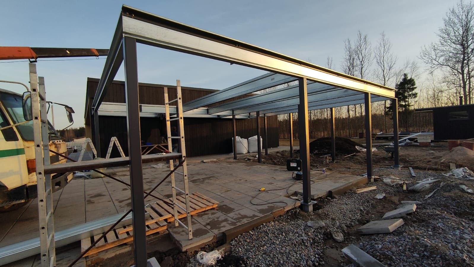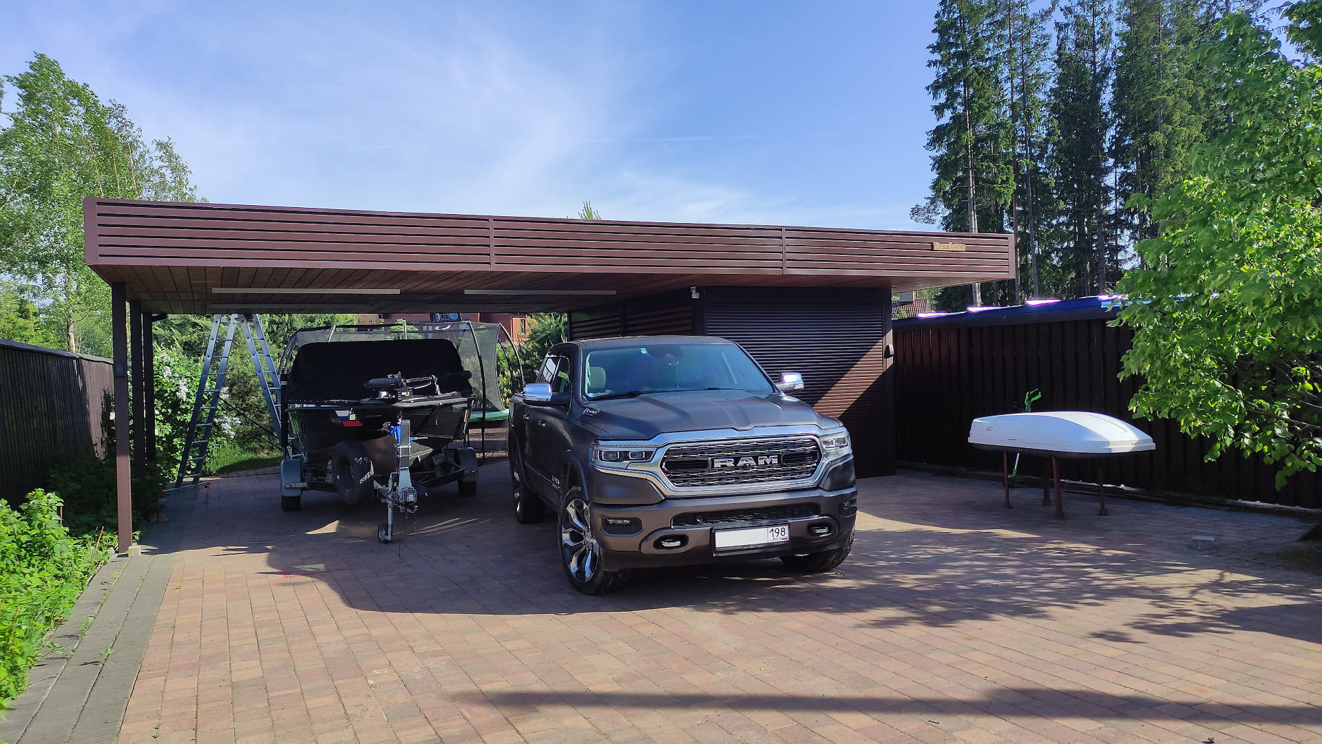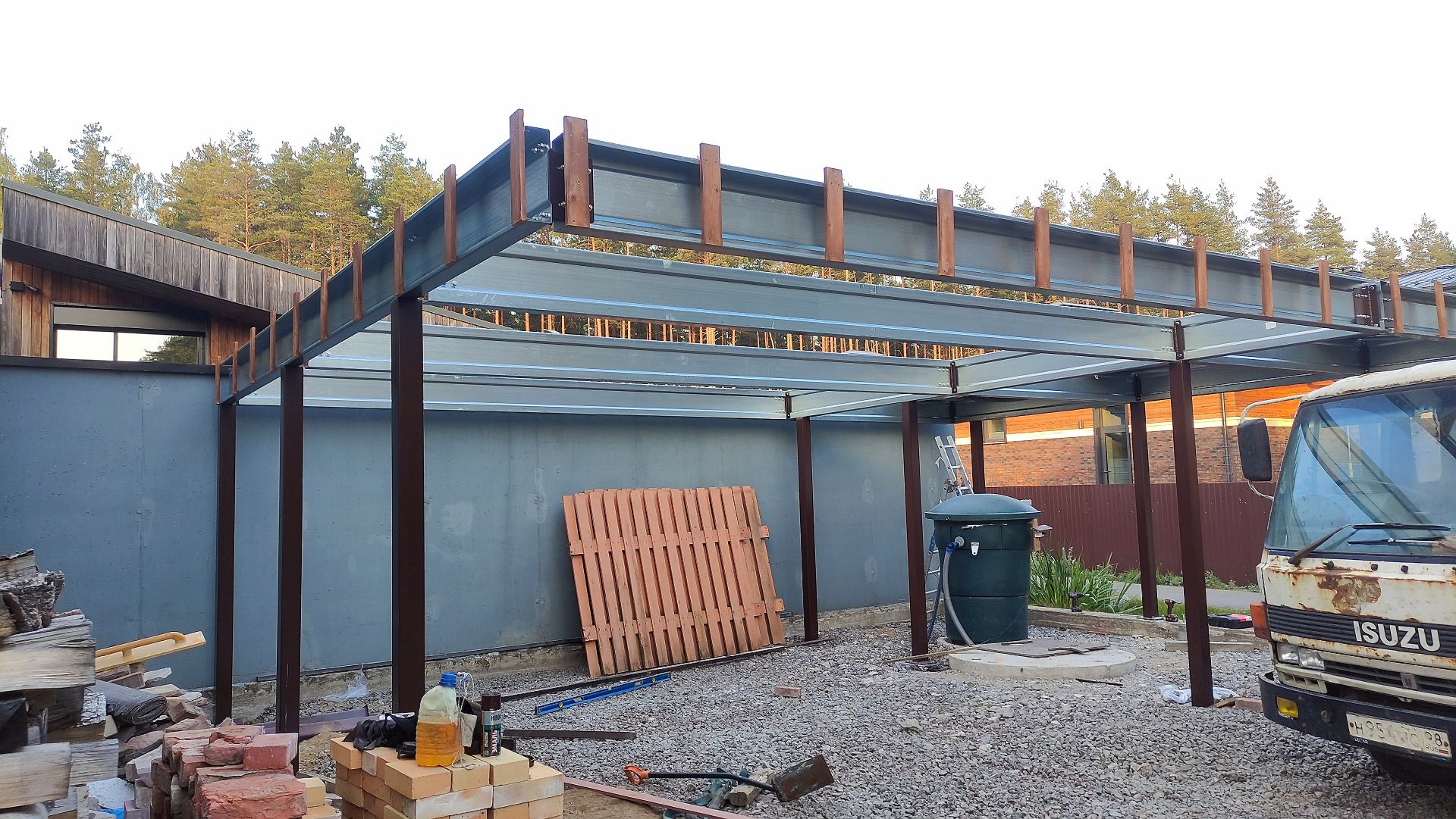 Ленинградская область. Навес 9.7 х 6.7 м на 2 места и хозблок. Стильная отделка фриза бруском, выкрашенным в цвет стен дома. Обшивку хозблока продолжим после ландшафтных работ и укладки брусчатки.