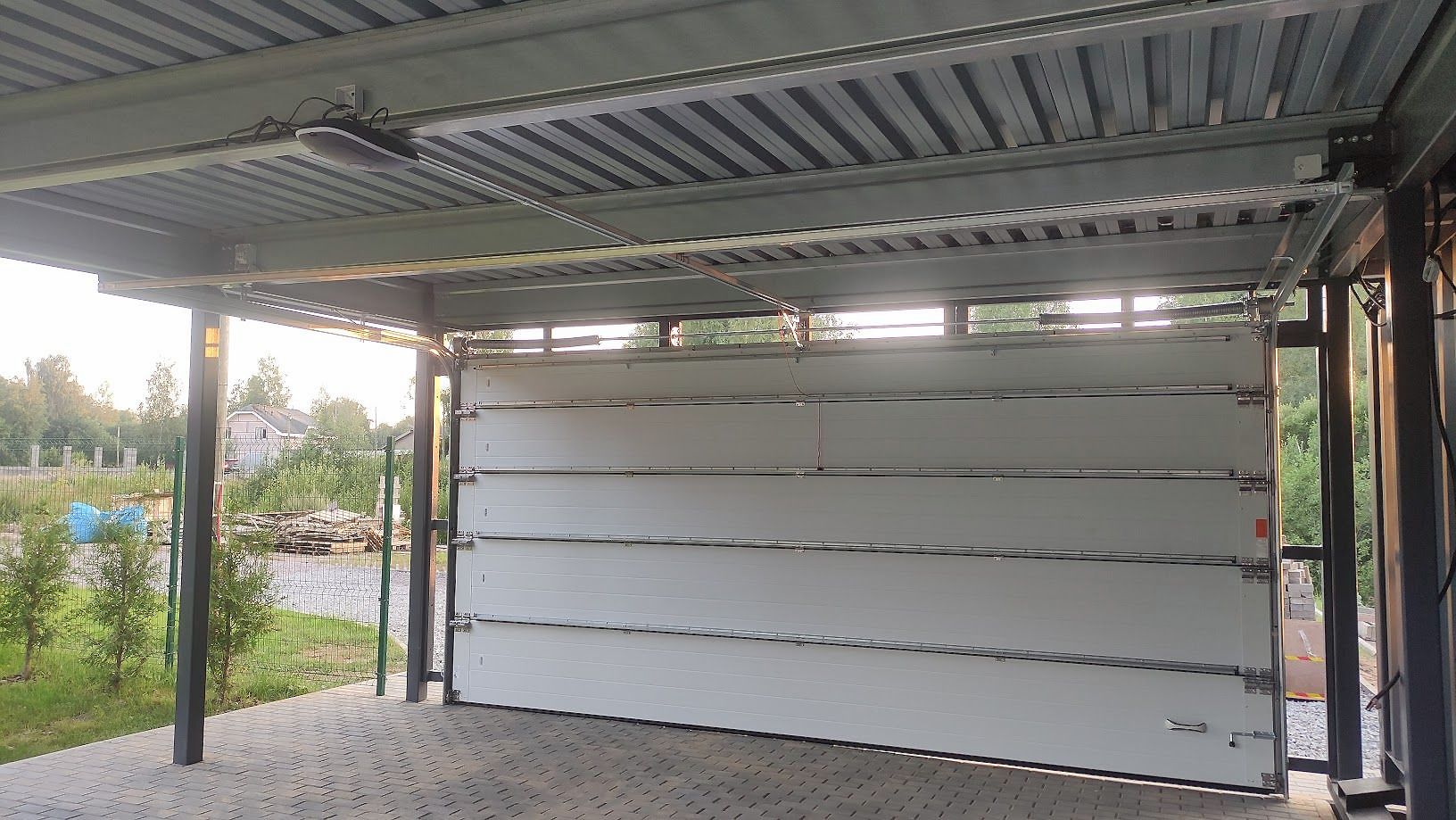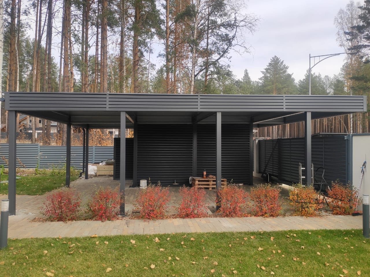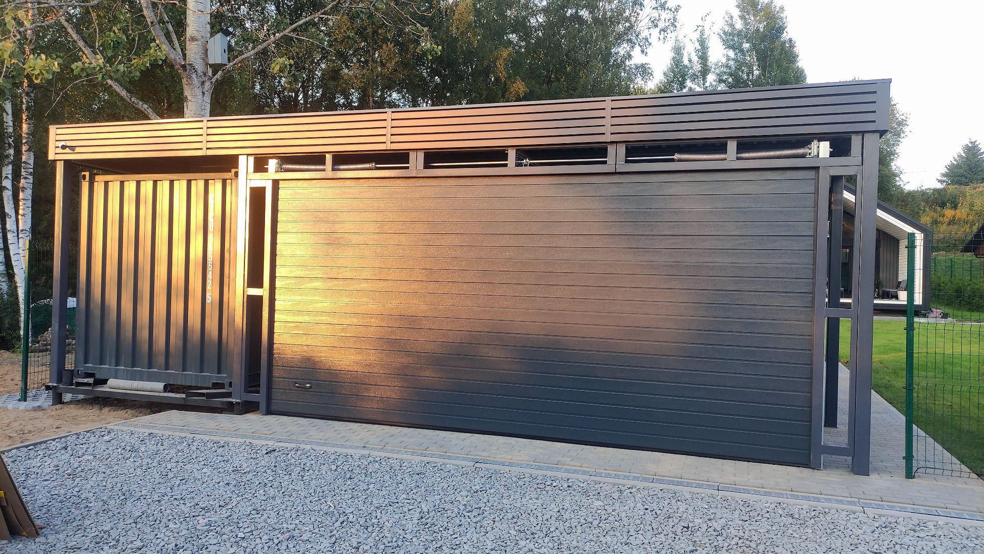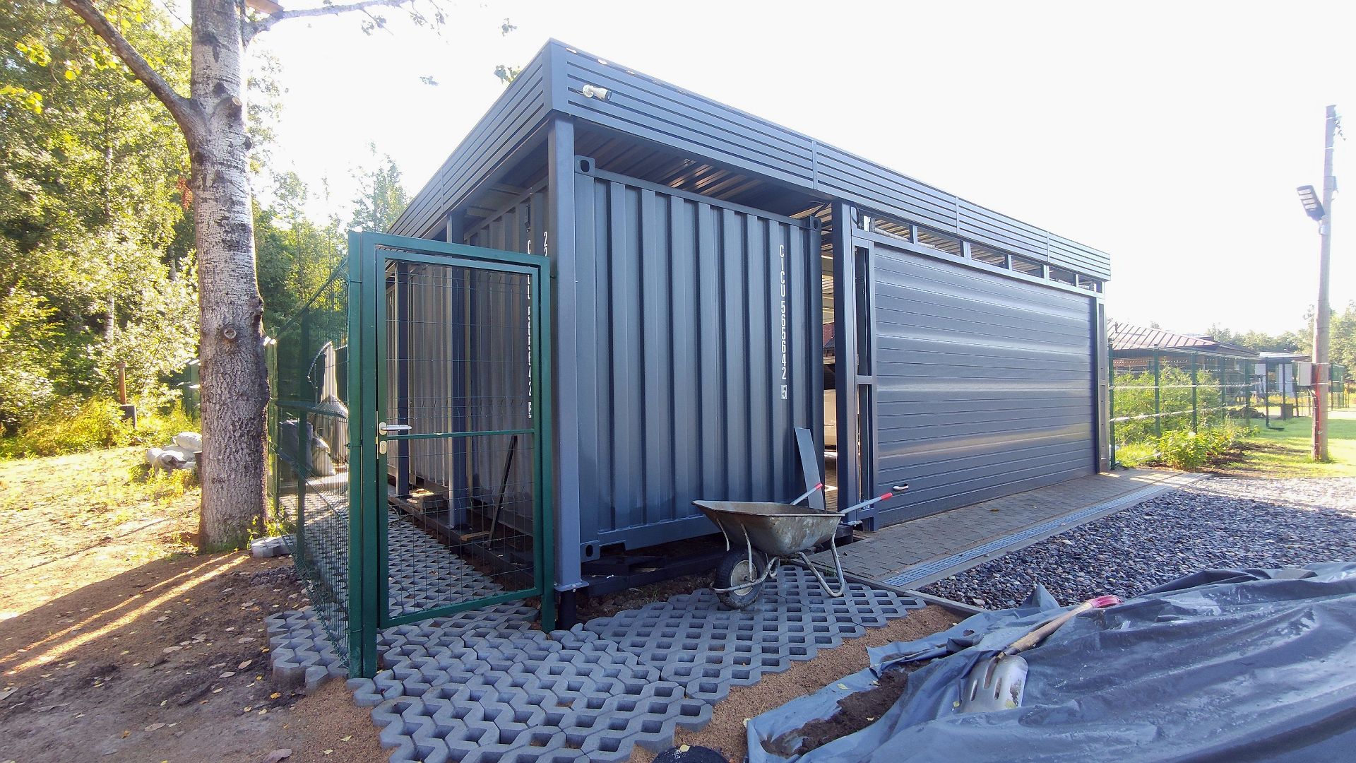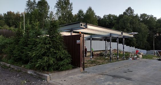 Ленинградская область. Навес 6.3х9 м с подъемно-секционными воротами шириной 6 м, установленный на линии будущего забора. Интересным решением было внедрение морского контейнера под навес в качестве хозблока.