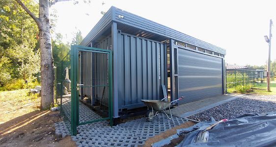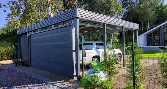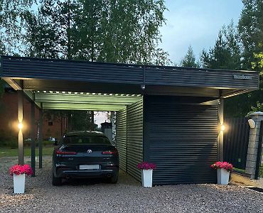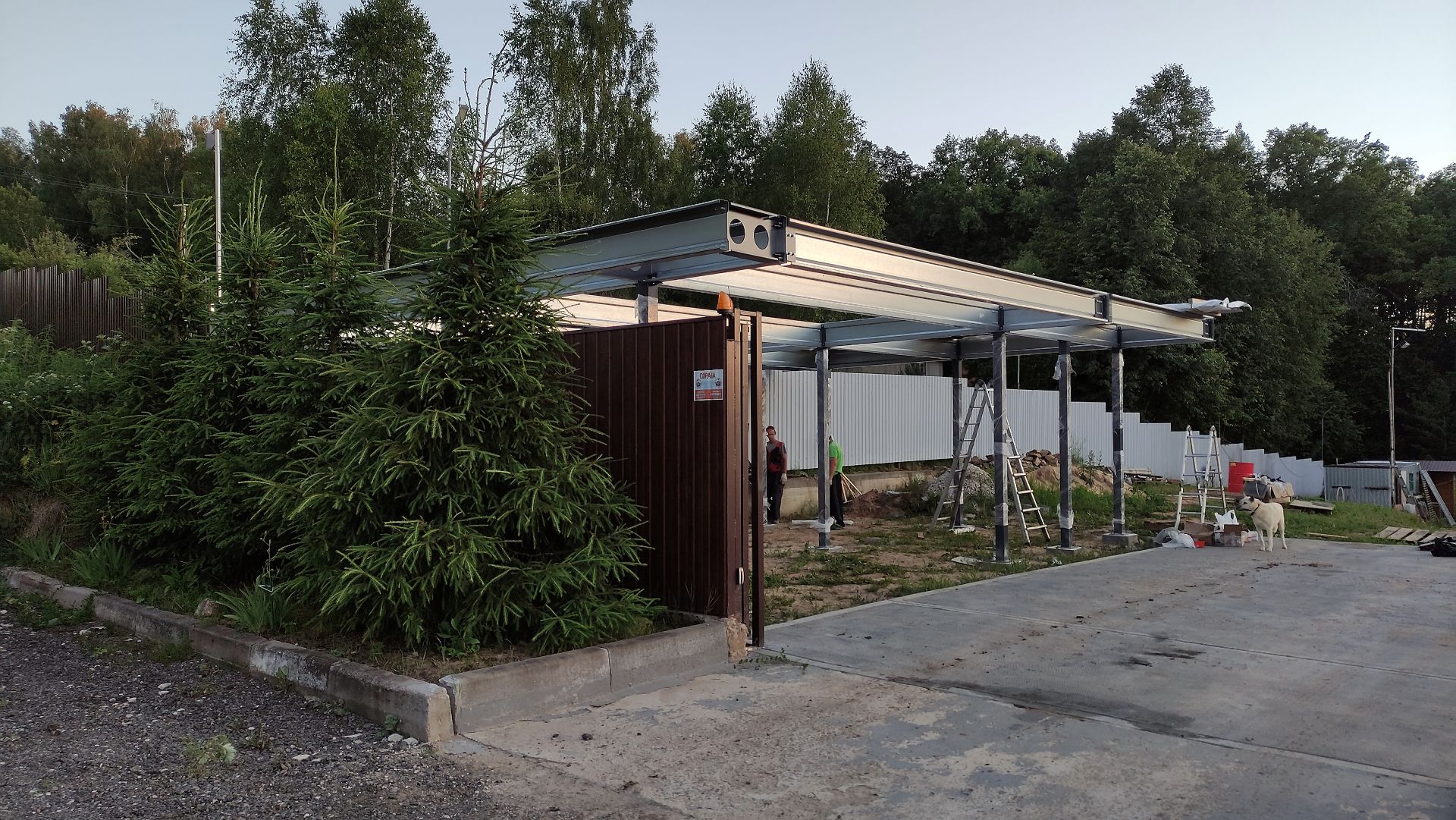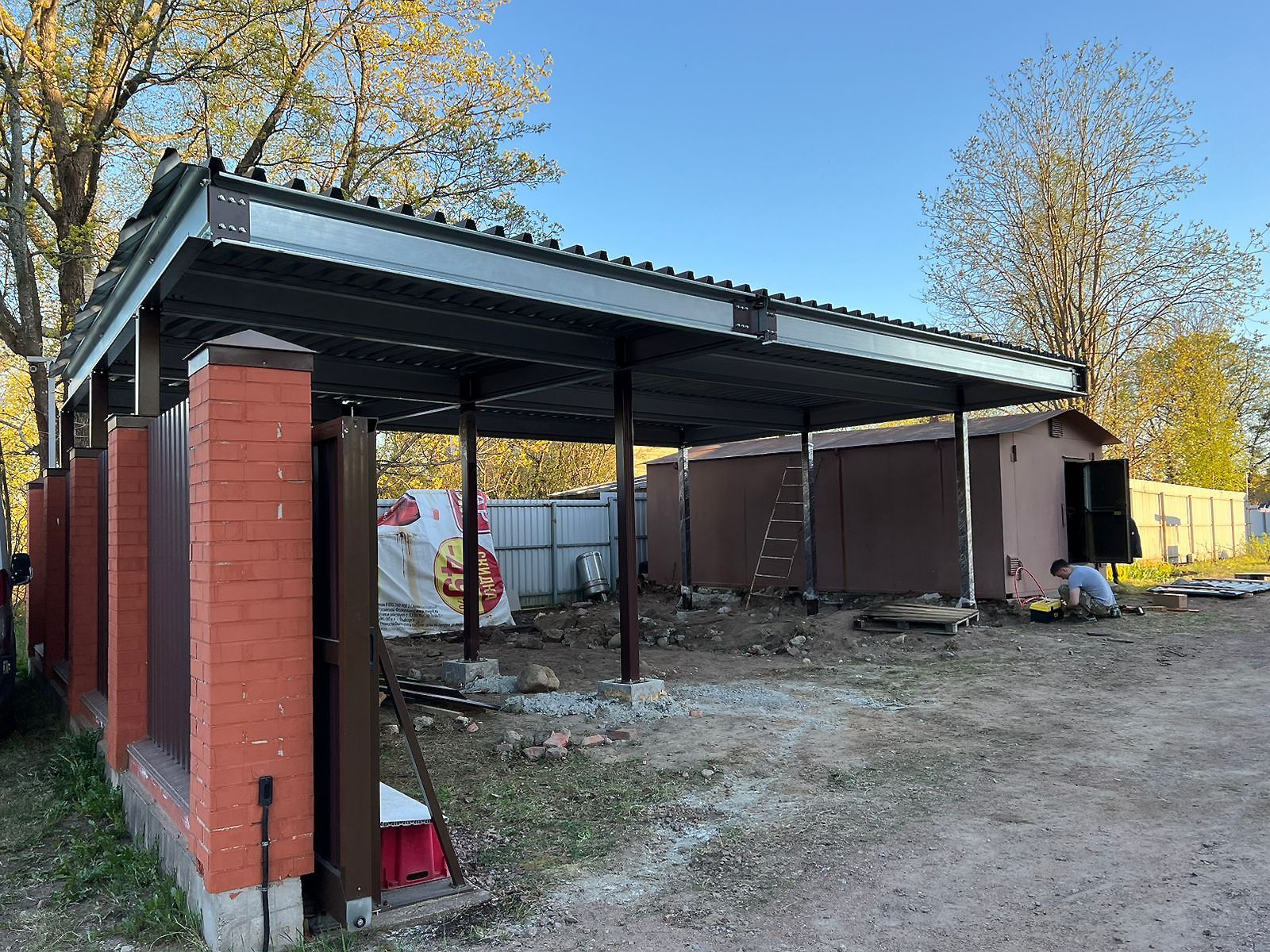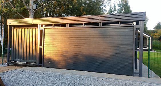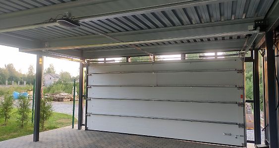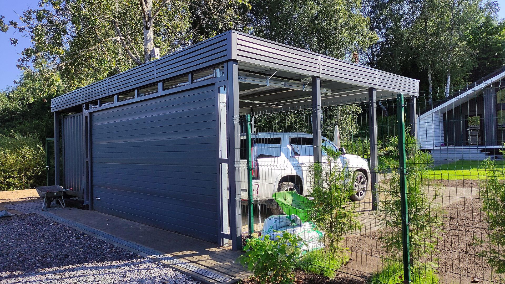 Ленинградская область. Навес 6.3х9 м с подъемно-секционными воротами шириной 6 м, установленный на линии будущего забора. Интересным решением было внедрение морского контейнера под навес в качестве хозблока.