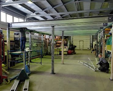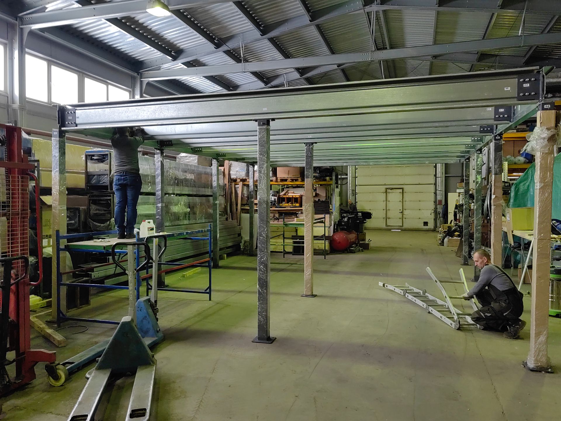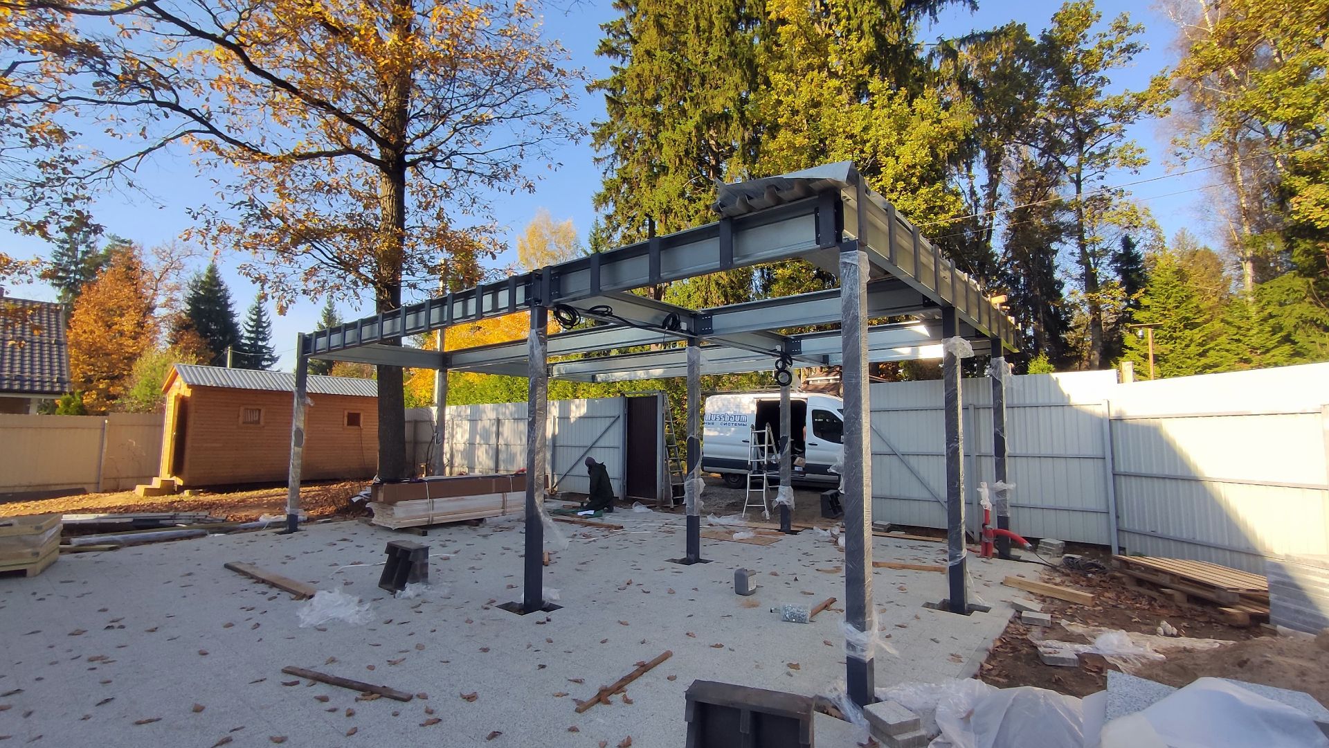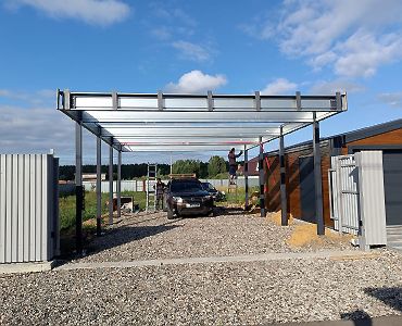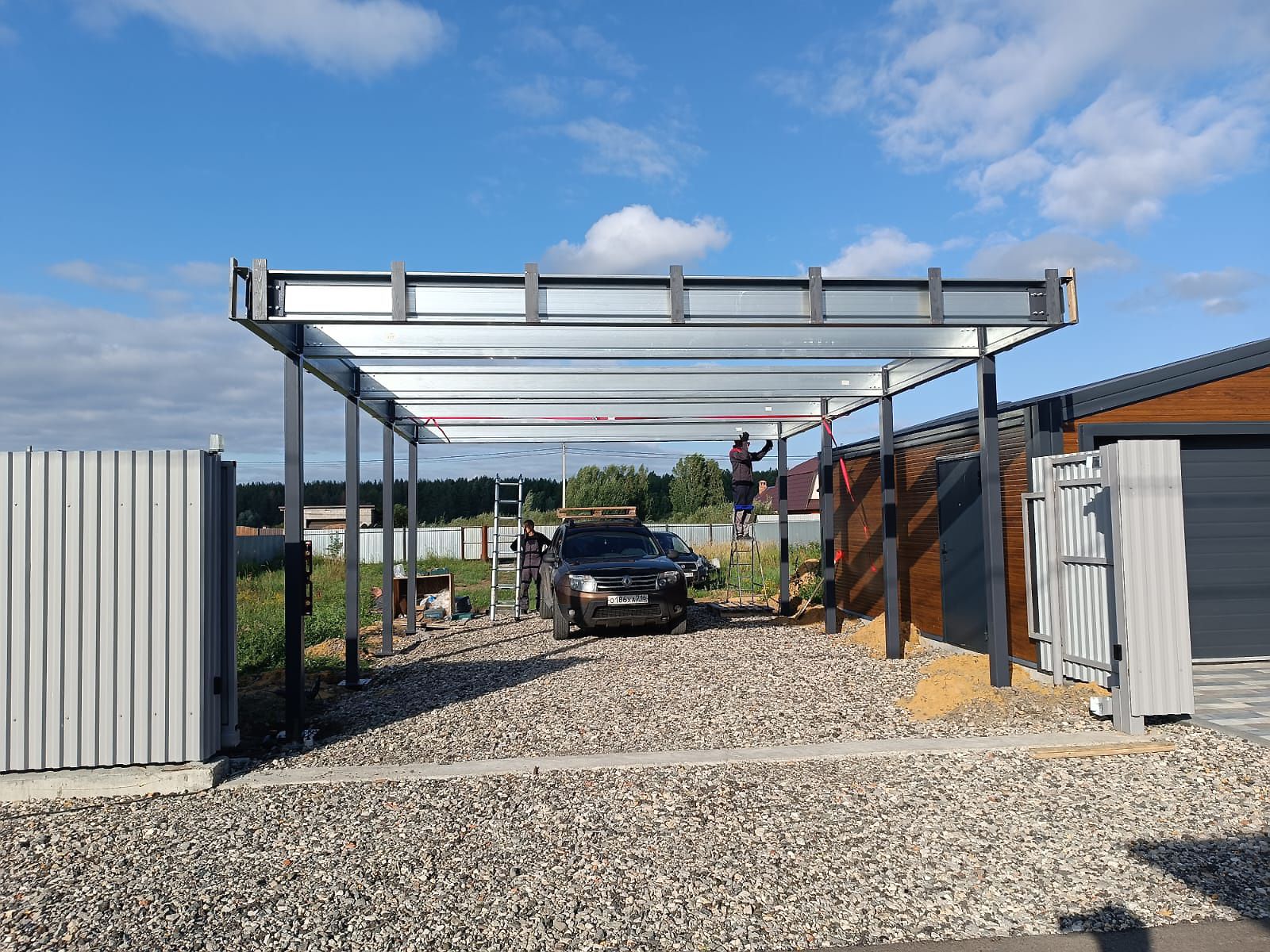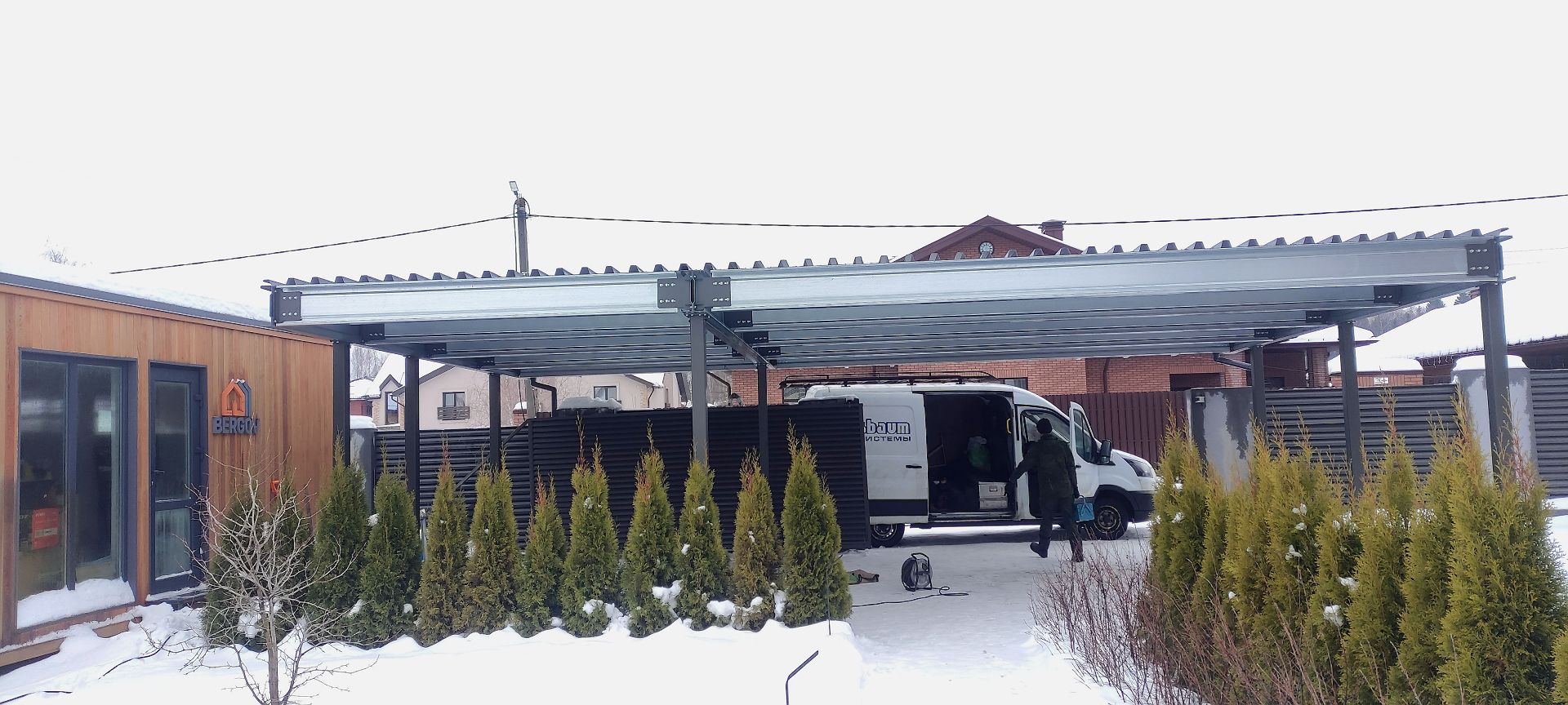 Ленинградская область. Навес 6.3х9 м с подъемно-секционными воротами шириной 6 м, установленный на линии будущего забора. Интересным решением было внедрение морского контейнера под навес в качестве хозблока.