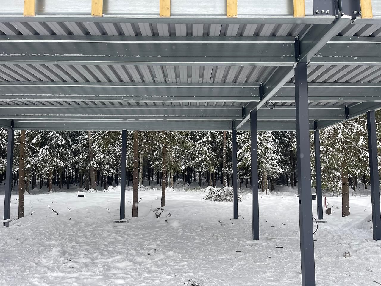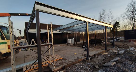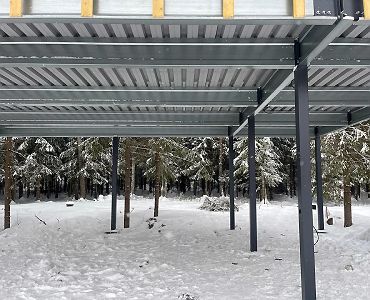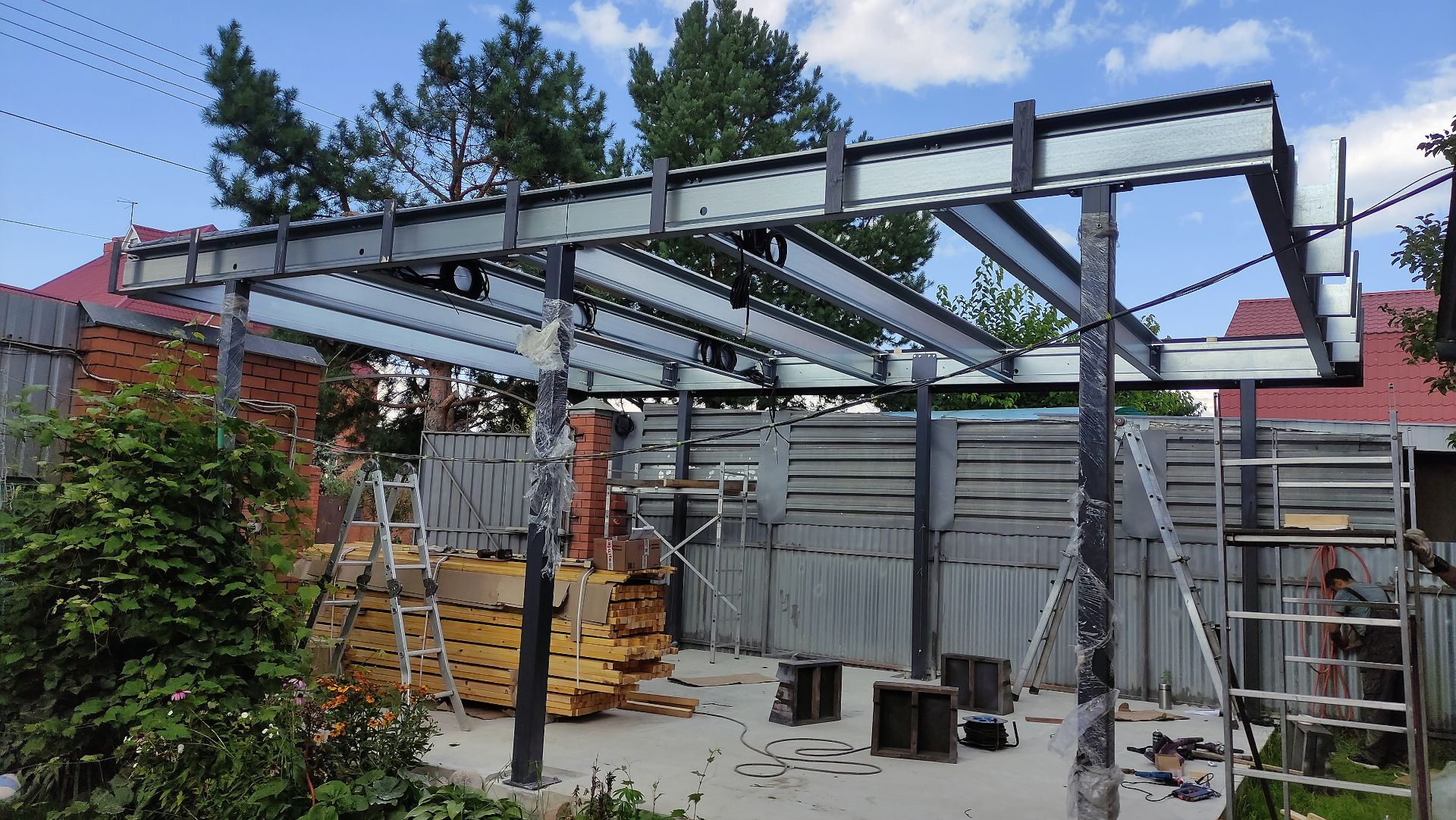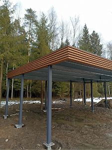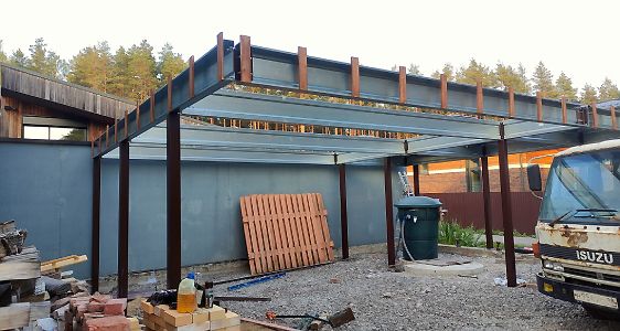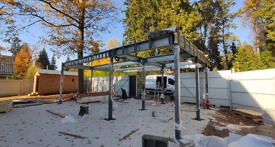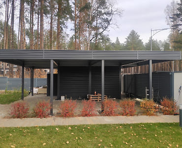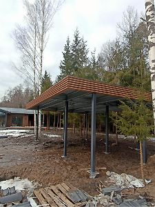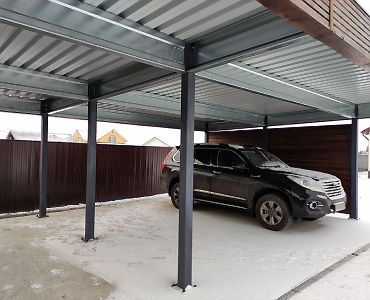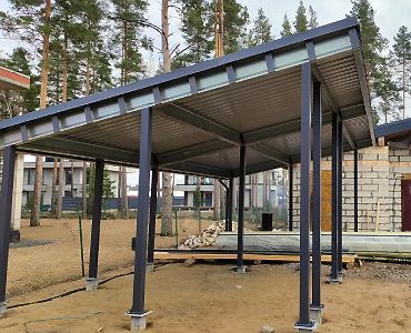Большой популярностью пользуются каркасы навесов с подготовкой под дальнейшую обшивку фриза и перегородок. Надежная конструкция из оцинкованного сигма-профиля, порошковая окраска колонн, болтовая сборка - лучшее сочетание для навеса, обеспечивающее максимальную надежность, защиту от коррозии и стильный внешний вид даже без отделки. Мы подобрали несколько фотографий таких объектов, чтобы наглядно продемонстрировать структуру каркаса наших навесов.