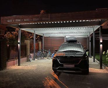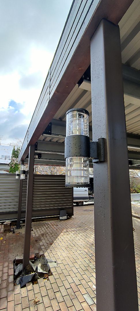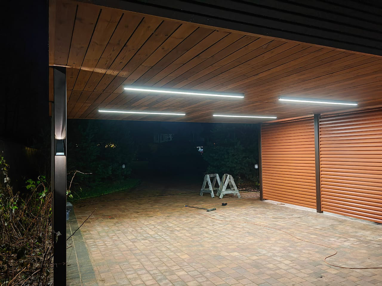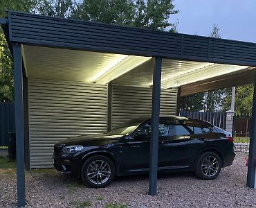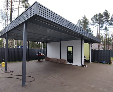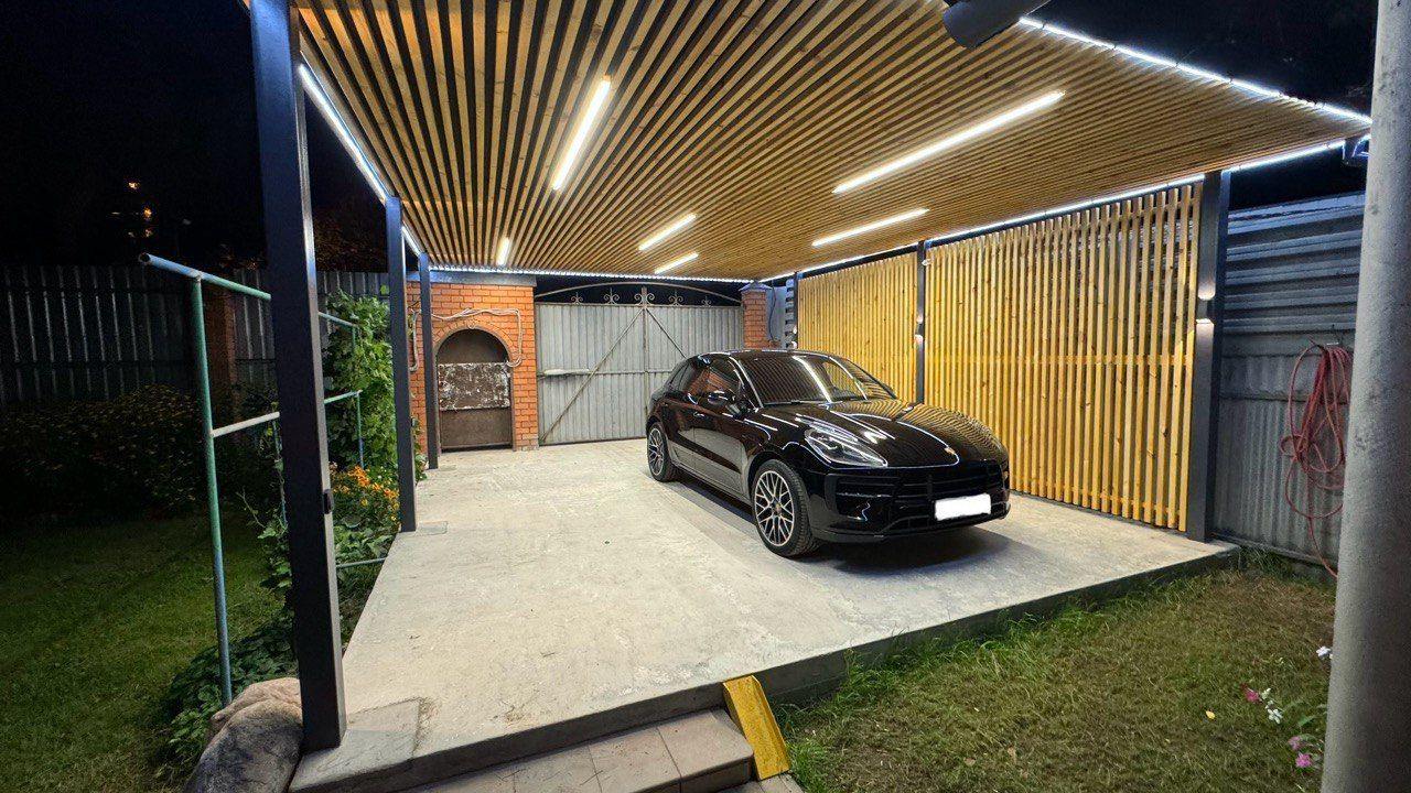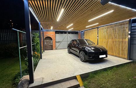 Ленинградская область. Навес 6х6,5 под одно машиноместо и хоз. блок, отделанный под мастерскую. Фоновое освещение парковочной зоны, архитектурная подсветка колонн, дополнительное освещение внутри мастерской.