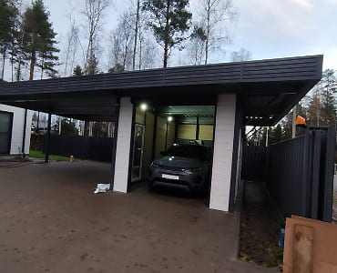 Ленинградская область, 11,4х6,8 м. Стильный навес и стильный барнхаус, классическое сочетание белой имитации бруса и матового графита.