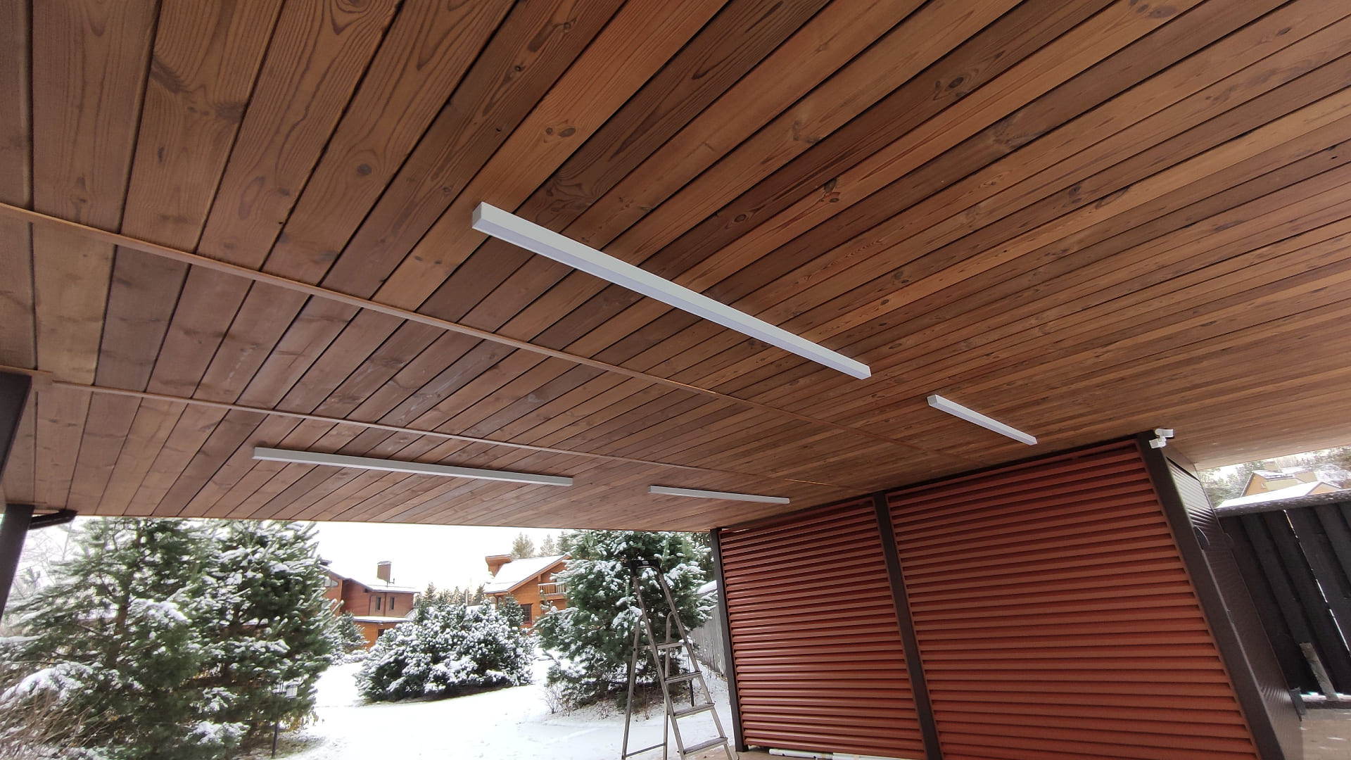 Московская область. Стильный и уютный навес 6х8,5 м. Отделка потолка и стен бруском, металлический фриз из ламелей с порошковой окраской. Различные режимы освещения.