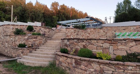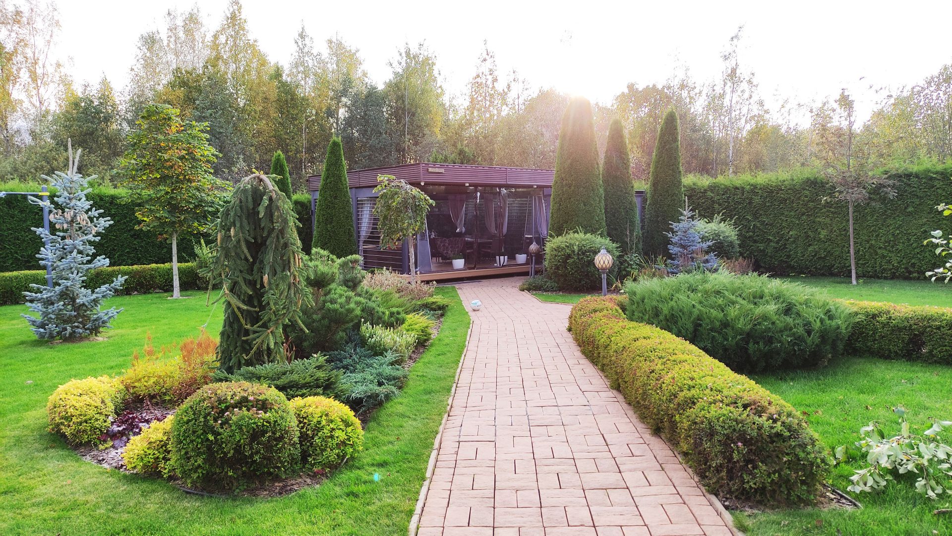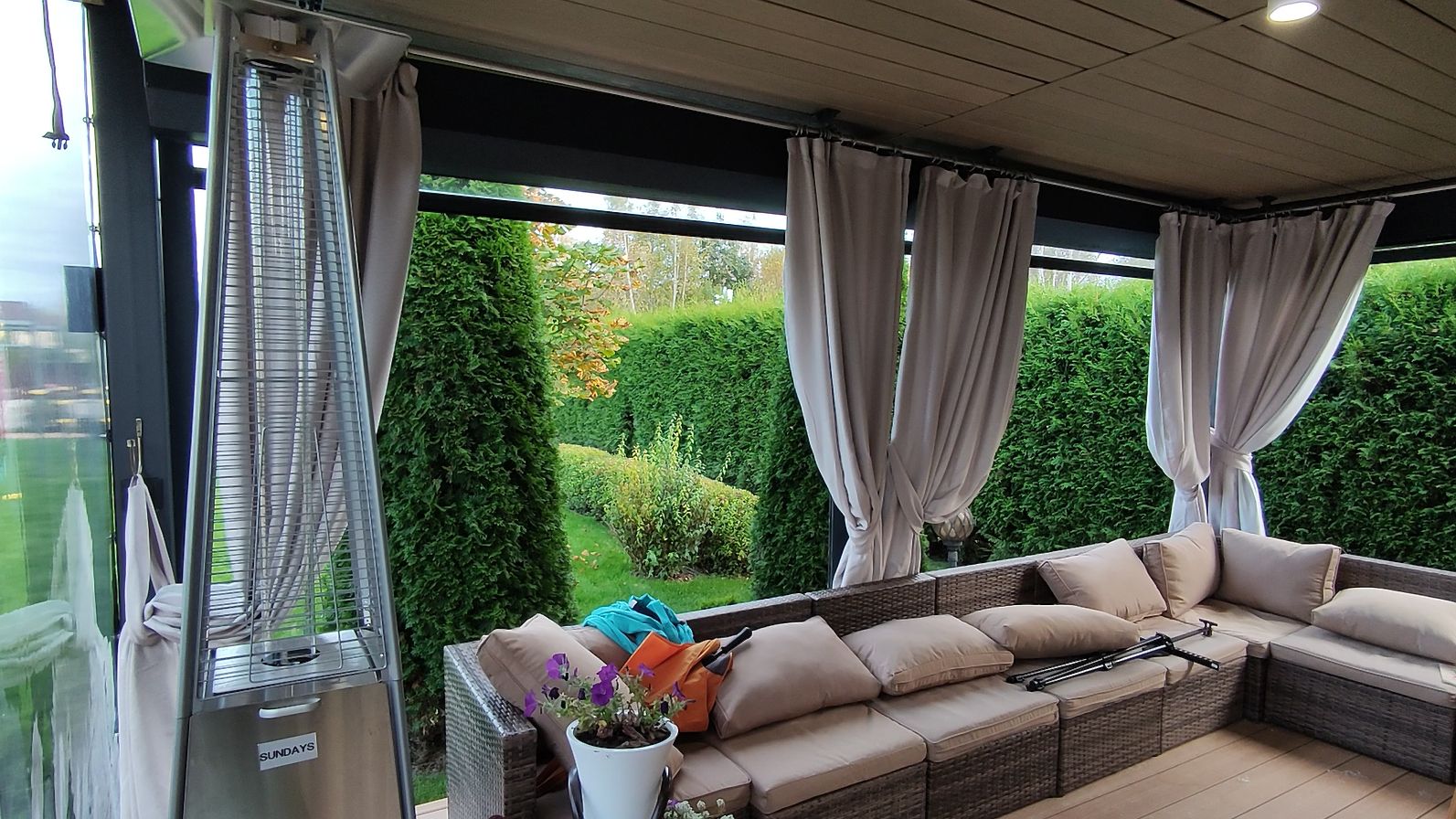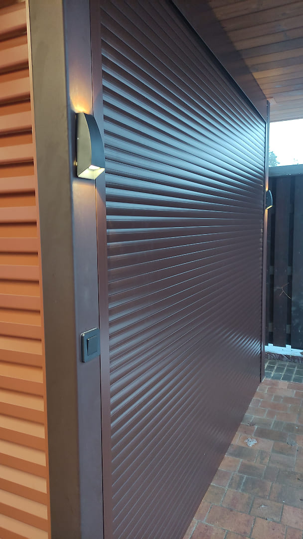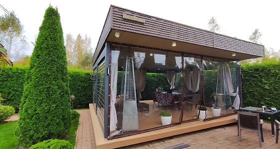 Московская область. Уникальная беседка в глубине участка. Прозрачные рольставни и мягкие окна надежно защищают от ветра и осадков в любое время года, не ограничивая обзор участка. Для штор разработаны специальные кронштейны, не создающие нагрузку на обшивку потолка.
