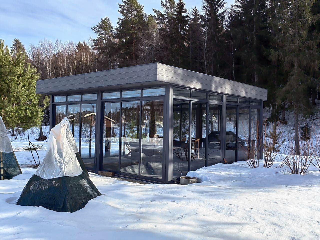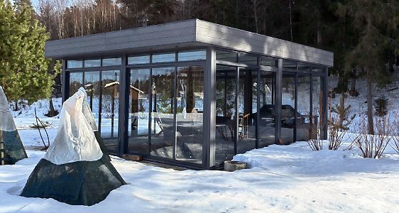 Ленинградская область. Еще одна интересная беседка 6х6 м в стиле хай-тек на берегу речки. Раздвижное остекление и поднятая терраса надежно защищают от непогоды.