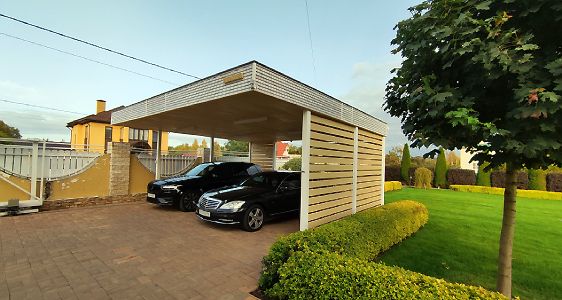 Московская область. Навес с увеличенной шириной 7х6,5 м. Смелое решение с белым фризом и колоннами отлично сочетается с архитектурой участка и дома.